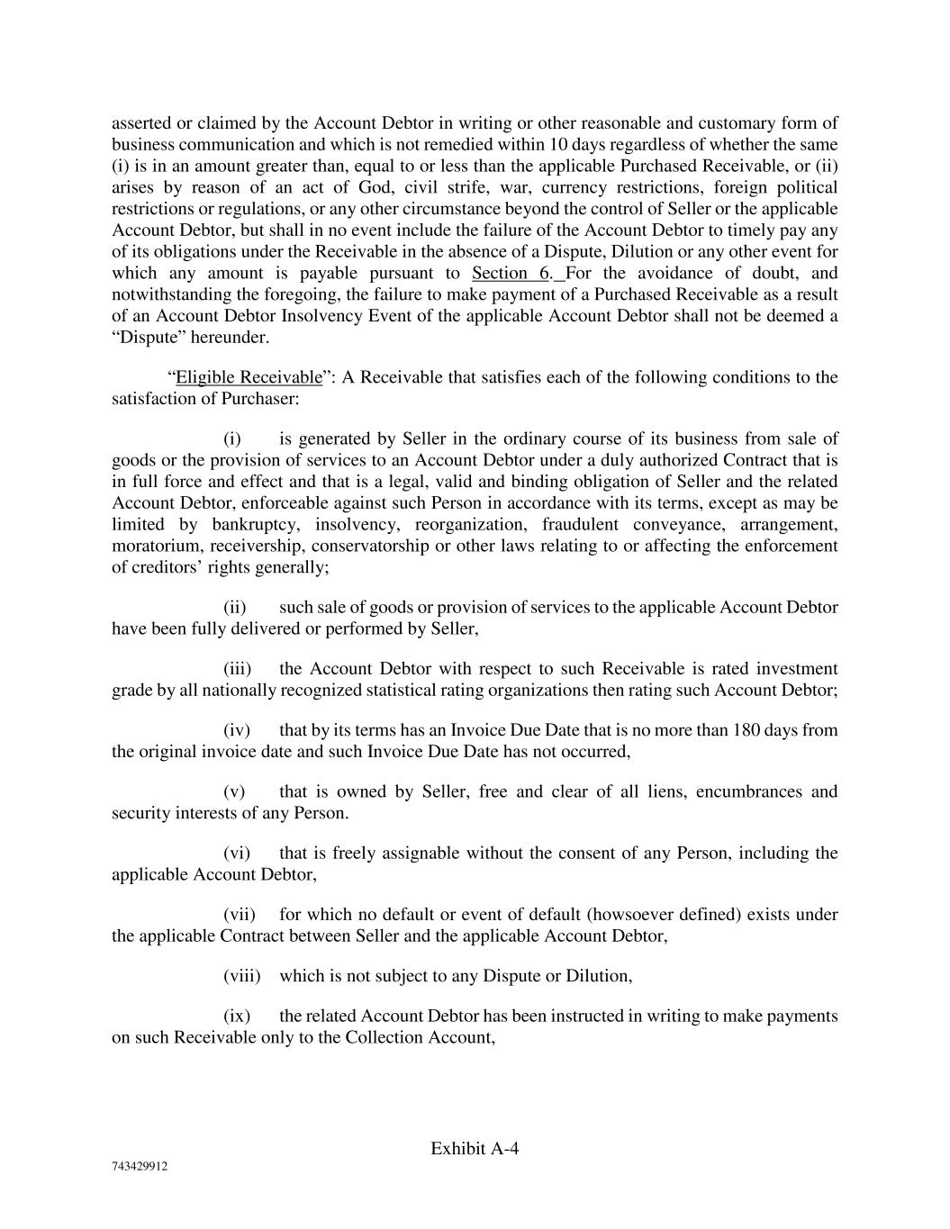 Exhibit A-4 743429912 asserted or claimed by the Account Debtor in writing or other reasonable and customary form of business communication and which is not remedied within 10 days regardless of whether the same (i) is in an amount greater than, equal to or less than the applicable Purchased Receivable, or (ii) arises by reason of an act of God, civil strife, war, currency restrictions, foreign political restrictions or regulations, or any other circumstance beyond the control of Seller or the applicable Account Debtor, but shall in no event include the failure of the Account Debtor to timely pay any of its obligations under the Receivable in the absence of a Dispute, Dilution or any other event for which any amount is payable pursuant to Section 6. For the avoidance of doubt, and notwithstanding the foregoing, the failure to make payment of a Purchased Receivable as a result of an Account Debtor Insolvency Event of the applicable Account Debtor shall not be deemed a “Dispute” hereunder. “Eligible Receivable”: A Receivable that satisfies each of the following conditions to the satisfaction of Purchaser: (i) is generated by Seller in the ordinary course of its business from sale of goods or the provision of services to an Account Debtor under a duly authorized Contract that is in full force and effect and that is a legal, valid and binding obligation of Seller and the related Account Debtor, enforceable against such Person in accordance with its terms, except as may be limited by bankruptcy, insolvency, reorganization, fraudulent conveyance, arrangement, moratorium, receivership, conservatorship or other laws relating to or affecting the enforcement of creditors’ rights generally; (ii) such sale of goods or provision of services to the applicable Account Debtor have been fully delivered or performed by Seller, (iii) the Account Debtor with respect to such Receivable is rated investment grade by all nationally recognized statistical rating organizations then rating such Account Debtor; (iv) that by its terms has an Invoice Due Date that is no more than 180 days from the original invoice date and such Invoice Due Date has not occurred, (v) that is owned by Seller, free and clear of all liens, encumbrances and security interests of any Person. (vi) that is freely assignable without the consent of any Person, including the applicable Account Debtor, (vii) for which no default or event of default (howsoever defined) exists under the applicable Contract between Seller and the applicable Account Debtor, (viii) which is not subject to any Dispute or Dilution, (ix) the related Account Debtor has been instructed in writing to make payments on such Receivable only to the Collection Account,