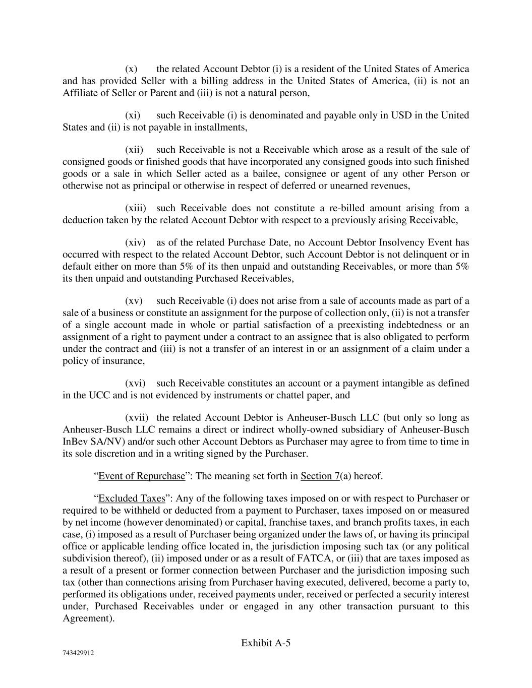 Exhibit A-5 743429912 (x) the related Account Debtor (i) is a resident of the United States of America and has provided Seller with a billing address in the United States of America, (ii) is not an Affiliate of Seller or Parent and (iii) is not a natural person, (xi) such Receivable (i) is denominated and payable only in USD in the United States and (ii) is not payable in installments, (xii) such Receivable is not a Receivable which arose as a result of the sale of consigned goods or finished goods that have incorporated any consigned goods into such finished goods or a sale in which Seller acted as a bailee, consignee or agent of any other Person or otherwise not as principal or otherwise in respect of deferred or unearned revenues, (xiii) such Receivable does not constitute a re-billed amount arising from a deduction taken by the related Account Debtor with respect to a previously arising Receivable, (xiv) as of the related Purchase Date, no Account Debtor Insolvency Event has occurred with respect to the related Account Debtor, such Account Debtor is not delinquent or in default either on more than 5% of its then unpaid and outstanding Receivables, or more than 5% its then unpaid and outstanding Purchased Receivables, (xv) such Receivable (i) does not arise from a sale of accounts made as part of a sale of a business or constitute an assignment for the purpose of collection only, (ii) is not a transfer of a single account made in whole or partial satisfaction of a preexisting indebtedness or an assignment of a right to payment under a contract to an assignee that is also obligated to perform under the contract and (iii) is not a transfer of an interest in or an assignment of a claim under a policy of insurance, (xvi) such Receivable constitutes an account or a payment intangible as defined in the UCC and is not evidenced by instruments or chattel paper, and (xvii) the related Account Debtor is Anheuser-Busch LLC (but only so long as Anheuser-Busch LLC remains a direct or indirect wholly-owned subsidiary of Anheuser-Busch InBev SA/NV) and/or such other Account Debtors as Purchaser may agree to from time to time in its sole discretion and in a writing signed by the Purchaser. “Event of Repurchase”: The meaning set forth in Section 7(a) hereof. “Excluded Taxes”: Any of the following taxes imposed on or with respect to Purchaser or required to be withheld or deducted from a payment to Purchaser, taxes imposed on or measured by net income (however denominated) or capital, franchise taxes, and branch profits taxes, in each case, (i) imposed as a result of Purchaser being organized under the laws of, or having its principal office or applicable lending office located in, the jurisdiction imposing such tax (or any political subdivision thereof), (ii) imposed under or as a result of FATCA, or (iii) that are taxes imposed as a result of a present or former connection between Purchaser and the jurisdiction imposing such tax (other than connections arising from Purchaser having executed, delivered, become a party to, performed its obligations under, received payments under, received or perfected a security interest under, Purchased Receivables under or engaged in any other transaction pursuant to this Agreement).