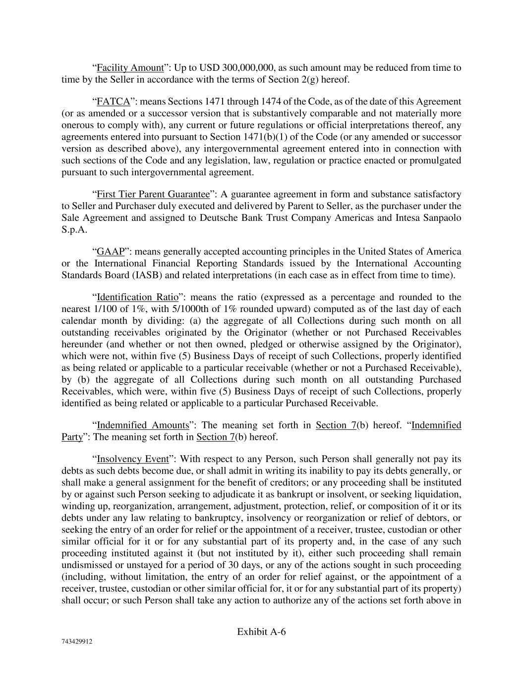 Exhibit A-6 743429912 “Facility Amount”: Up to USD 300,000,000, as such amount may be reduced from time to time by the Seller in accordance with the terms of Section 2(g) hereof. “FATCA”: means Sections 1471 through 1474 of the Code, as of the date of this Agreement (or as amended or a successor version that is substantively comparable and not materially more onerous to comply with), any current or future regulations or official interpretations thereof, any agreements entered into pursuant to Section 1471(b)(1) of the Code (or any amended or successor version as described above), any intergovernmental agreement entered into in connection with such sections of the Code and any legislation, law, regulation or practice enacted or promulgated pursuant to such intergovernmental agreement. “First Tier Parent Guarantee”: A guarantee agreement in form and substance satisfactory to Seller and Purchaser duly executed and delivered by Parent to Seller, as the purchaser under the Sale Agreement and assigned to Deutsche Bank Trust Company Americas and Intesa Sanpaolo S.p.A. “GAAP”: means generally accepted accounting principles in the United States of America or the International Financial Reporting Standards issued by the International Accounting Standards Board (IASB) and related interpretations (in each case as in effect from time to time). “Identification Ratio”: means the ratio (expressed as a percentage and rounded to the nearest 1/100 of 1%, with 5/1000th of 1% rounded upward) computed as of the last day of each calendar month by dividing: (a) the aggregate of all Collections during such month on all outstanding receivables originated by the Originator (whether or not Purchased Receivables hereunder (and whether or not then owned, pledged or otherwise assigned by the Originator), which were not, within five (5) Business Days of receipt of such Collections, properly identified as being related or applicable to a particular receivable (whether or not a Purchased Receivable), by (b) the aggregate of all Collections during such month on all outstanding Purchased Receivables, which were, within five (5) Business Days of receipt of such Collections, properly identified as being related or applicable to a particular Purchased Receivable. “Indemnified Amounts”: The meaning set forth in Section 7(b) hereof. “Indemnified Party”: The meaning set forth in Section 7(b) hereof. “Insolvency Event”: With respect to any Person, such Person shall generally not pay its debts as such debts become due, or shall admit in writing its inability to pay its debts generally, or shall make a general assignment for the benefit of creditors; or any proceeding shall be instituted by or against such Person seeking to adjudicate it as bankrupt or insolvent, or seeking liquidation, winding up, reorganization, arrangement, adjustment, protection, relief, or composition of it or its debts under any law relating to bankruptcy, insolvency or reorganization or relief of debtors, or seeking the entry of an order for relief or the appointment of a receiver, trustee, custodian or other similar official for it or for any substantial part of its property and, in the case of any such proceeding instituted against it (but not instituted by it), either such proceeding shall remain undismissed or unstayed for a period of 30 days, or any of the actions sought in such proceeding (including, without limitation, the entry of an order for relief against, or the appointment of a receiver, trustee, custodian or other similar official for, it or for any substantial part of its property) shall occur; or such Person shall take any action to authorize any of the actions set forth above in