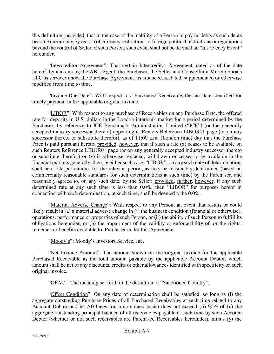 Exhibit A-7 743429912 this definition; provided, that in the case of the inability of a Person to pay its debts as such debts become due arising by reason of currency restrictions or foreign political restrictions or regulations beyond the control of Seller or such Person, such event shall not be deemed an “Insolvency Event” hereunder. “Intercreditor Agreement”: That certain Intercreditor Agreement, dated as of the date hereof, by and among the ABL Agent, the Purchaser, the Seller and Constellium Muscle Shoals LLC as servicer under the Purchase Agreement, as amended, restated, supplemented or otherwise modified from time to time. “Invoice Due Date”: With respect to a Purchased Receivable, the last date identified for timely payment in the applicable original invoice. “LIBOR”: With respect to any purchase of Receivables on any Purchase Date, the offered rate for deposits in U.S. dollars in the London interbank market for a period determined by the Purchaser, by reference to ICE Benchmark Administration Limited (“ICE”) (or the generally accepted industry successor thereto) appearing at Reuters Reference LIBOR01 page (or on any successor thereto or substitute therefor), as of 11:00 a.m. (London time) day that the Purchase Price is paid pursuant hereto; provided, however, that if such a rate (x) ceases to be available on such Reuters Reference LIBOR01 page (or on any generally accepted industry successor thereto or substitute therefor) or (y) is otherwise replaced, withdrawn or ceases to be available in the financial markets generally, then, in either such case, “LIBOR”, on any such date of determination, shall be a rate per annum, for the relevant period, as may be reasonably determined (based on commercially reasonable standards for such determinations at such time) by the Purchaser, and reasonably agreed to, on any such date, by the Seller; provided, further, however, if any such determined rate at any such time is less than 0.0%, then “LIBOR” for purposes hereof in connection with such determination, at such time, shall be deemed to be 0.0%. “Material Adverse Change”: With respect to any Person, an event that results or could likely result in (a) a material adverse change in (i) the business condition (financial or otherwise), operations, performance or properties of such Person, or (ii) the ability of such Person to fulfill its obligations hereunder, or (b) the impairment of the validity or enforceability of, or the rights, remedies or benefits available to, Purchaser under this Agreement. “Moody’s”: Moody’s Investors Service, Inc. “Net Invoice Amount”: The amount shown on the original invoice for the applicable Purchased Receivable as the total amount payable by the applicable Account Debtor, which amount shall be net of any discounts, credits or other allowances identified with specificity on such original invoice. “OFAC”: The meaning set forth in the definition of “Sanctioned Country”. “Offset Condition”: On any date of determination shall be satisfied, so long as (i) the aggregate outstanding Purchase Prices of all Purchased Receivables at such time related to any Account Debtor and its Affiliates (on a combined basis) does not exceed (ii) 90% of (x) the aggregate outstanding principal balance of all receivables payable at such time by such Account Debtor (whether or not such receivables are Purchased Receivables hereunder), minus (y) the
