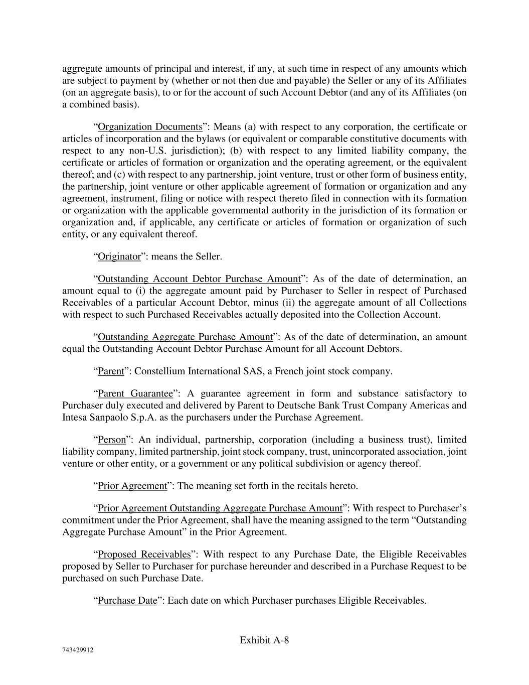 Exhibit A-8 743429912 aggregate amounts of principal and interest, if any, at such time in respect of any amounts which are subject to payment by (whether or not then due and payable) the Seller or any of its Affiliates (on an aggregate basis), to or for the account of such Account Debtor (and any of its Affiliates (on a combined basis). “Organization Documents”: Means (a) with respect to any corporation, the certificate or articles of incorporation and the bylaws (or equivalent or comparable constitutive documents with respect to any non-U.S. jurisdiction); (b) with respect to any limited liability company, the certificate or articles of formation or organization and the operating agreement, or the equivalent thereof; and (c) with respect to any partnership, joint venture, trust or other form of business entity, the partnership, joint venture or other applicable agreement of formation or organization and any agreement, instrument, filing or notice with respect thereto filed in connection with its formation or organization with the applicable governmental authority in the jurisdiction of its formation or organization and, if applicable, any certificate or articles of formation or organization of such entity, or any equivalent thereof. “Originator”: means the Seller. “Outstanding Account Debtor Purchase Amount”: As of the date of determination, an amount equal to (i) the aggregate amount paid by Purchaser to Seller in respect of Purchased Receivables of a particular Account Debtor, minus (ii) the aggregate amount of all Collections with respect to such Purchased Receivables actually deposited into the Collection Account. “Outstanding Aggregate Purchase Amount”: As of the date of determination, an amount equal the Outstanding Account Debtor Purchase Amount for all Account Debtors. “Parent”: Constellium International SAS, a French joint stock company. “Parent Guarantee”: A guarantee agreement in form and substance satisfactory to Purchaser duly executed and delivered by Parent to Deutsche Bank Trust Company Americas and Intesa Sanpaolo S.p.A. as the purchasers under the Purchase Agreement. “Person”: An individual, partnership, corporation (including a business trust), limited liability company, limited partnership, joint stock company, trust, unincorporated association, joint venture or other entity, or a government or any political subdivision or agency thereof. “Prior Agreement”: The meaning set forth in the recitals hereto. “Prior Agreement Outstanding Aggregate Purchase Amount”: With respect to Purchaser’s commitment under the Prior Agreement, shall have the meaning assigned to the term “Outstanding Aggregate Purchase Amount” in the Prior Agreement. “Proposed Receivables”: With respect to any Purchase Date, the Eligible Receivables proposed by Seller to Purchaser for purchase hereunder and described in a Purchase Request to be purchased on such Purchase Date. “Purchase Date”: Each date on which Purchaser purchases Eligible Receivables.