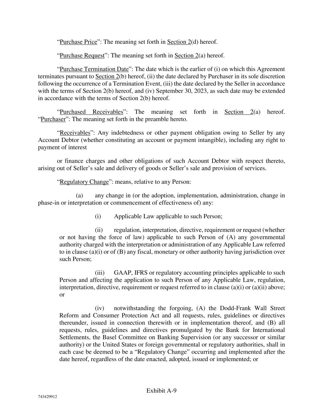 Exhibit A-9 743429912 “Purchase Price”: The meaning set forth in Section 2(d) hereof. “Purchase Request”: The meaning set forth in Section 2(a) hereof. “Purchase Termination Date”: The date which is the earlier of (i) on which this Agreement terminates pursuant to Section 2(b) hereof, (ii) the date declared by Purchaser in its sole discretion following the occurrence of a Termination Event, (iii) the date declared by the Seller in accordance with the terms of Section 2(b) hereof, and (iv) September 30, 2023, as such date may be extended in accordance with the terms of Section 2(b) hereof. “Purchased Receivables”: The meaning set forth in Section 2(a) hereof. “Purchaser”: The meaning set forth in the preamble hereto. “Receivables”: Any indebtedness or other payment obligation owing to Seller by any Account Debtor (whether constituting an account or payment intangible), including any right to payment of interest or finance charges and other obligations of such Account Debtor with respect thereto, arising out of Seller’s sale and delivery of goods or Seller’s sale and provision of services. “Regulatory Change”: means, relative to any Person: (a) any change in (or the adoption, implementation, administration, change in phase-in or interpretation or commencement of effectiveness of) any: (i) Applicable Law applicable to such Person; (ii) regulation, interpretation, directive, requirement or request (whether or not having the force of law) applicable to such Person of (A) any governmental authority charged with the interpretation or administration of any Applicable Law referred to in clause (a)(i) or of (B) any fiscal, monetary or other authority having jurisdiction over such Person; (iii) GAAP, IFRS or regulatory accounting principles applicable to such Person and affecting the application to such Person of any Applicable Law, regulation, interpretation, directive, requirement or request referred to in clause (a)(i) or (a)(ii) above; or (iv) notwithstanding the forgoing, (A) the Dodd-Frank Wall Street Reform and Consumer Protection Act and all requests, rules, guidelines or directives thereunder, issued in connection therewith or in implementation thereof, and (B) all requests, rules, guidelines and directives promulgated by the Bank for International Settlements, the Basel Committee on Banking Supervision (or any successor or similar authority) or the United States or foreign governmental or regulatory authorities, shall in each case be deemed to be a “Regulatory Change” occurring and implemented after the date hereof, regardless of the date enacted, adopted, issued or implemented; or