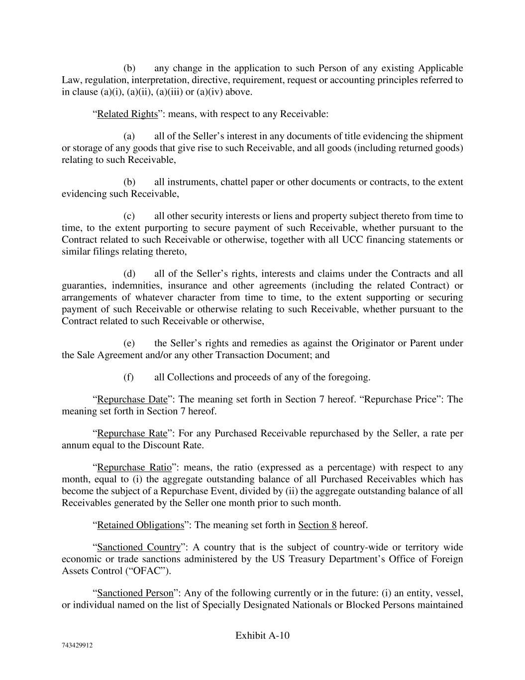 Exhibit A-10 743429912 (b) any change in the application to such Person of any existing Applicable Law, regulation, interpretation, directive, requirement, request or accounting principles referred to in clause (a)(i), (a)(ii), (a)(iii) or (a)(iv) above. “Related Rights”: means, with respect to any Receivable: (a) all of the Seller’s interest in any documents of title evidencing the shipment or storage of any goods that give rise to such Receivable, and all goods (including returned goods) relating to such Receivable, (b) all instruments, chattel paper or other documents or contracts, to the extent evidencing such Receivable, (c) all other security interests or liens and property subject thereto from time to time, to the extent purporting to secure payment of such Receivable, whether pursuant to the Contract related to such Receivable or otherwise, together with all UCC financing statements or similar filings relating thereto, (d) all of the Seller’s rights, interests and claims under the Contracts and all guaranties, indemnities, insurance and other agreements (including the related Contract) or arrangements of whatever character from time to time, to the extent supporting or securing payment of such Receivable or otherwise relating to such Receivable, whether pursuant to the Contract related to such Receivable or otherwise, (e) the Seller’s rights and remedies as against the Originator or Parent under the Sale Agreement and/or any other Transaction Document; and (f) all Collections and proceeds of any of the foregoing. “Repurchase Date”: The meaning set forth in Section 7 hereof. “Repurchase Price”: The meaning set forth in Section 7 hereof. “Repurchase Rate”: For any Purchased Receivable repurchased by the Seller, a rate per annum equal to the Discount Rate. “Repurchase Ratio”: means, the ratio (expressed as a percentage) with respect to any month, equal to (i) the aggregate outstanding balance of all Purchased Receivables which has become the subject of a Repurchase Event, divided by (ii) the aggregate outstanding balance of all Receivables generated by the Seller one month prior to such month. “Retained Obligations”: The meaning set forth in Section 8 hereof. “Sanctioned Country”: A country that is the subject of country-wide or territory wide economic or trade sanctions administered by the US Treasury Department’s Office of Foreign Assets Control (“OFAC”). “Sanctioned Person”: Any of the following currently or in the future: (i) an entity, vessel, or individual named on the list of Specially Designated Nationals or Blocked Persons maintained