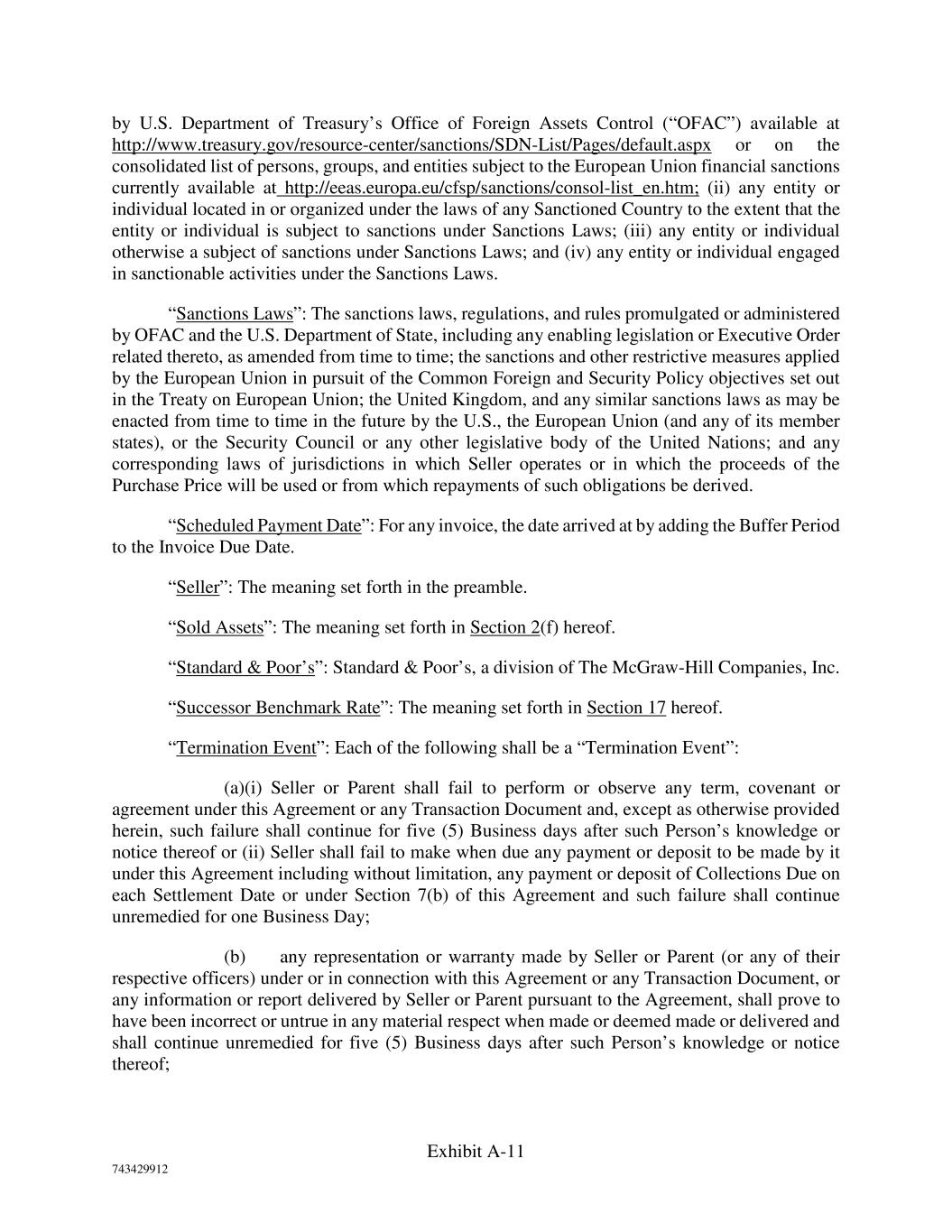 Exhibit A-11 743429912 by U.S. Department of Treasury’s Office of Foreign Assets Control (“OFAC”) available at http://www.treasury.gov/resource-center/sanctions/SDN-List/Pages/default.aspx or on the consolidated list of persons, groups, and entities subject to the European Union financial sanctions currently available at http://eeas.europa.eu/cfsp/sanctions/consol-list_en.htm; (ii) any entity or individual located in or organized under the laws of any Sanctioned Country to the extent that the entity or individual is subject to sanctions under Sanctions Laws; (iii) any entity or individual otherwise a subject of sanctions under Sanctions Laws; and (iv) any entity or individual engaged in sanctionable activities under the Sanctions Laws. “Sanctions Laws”: The sanctions laws, regulations, and rules promulgated or administered by OFAC and the U.S. Department of State, including any enabling legislation or Executive Order related thereto, as amended from time to time; the sanctions and other restrictive measures applied by the European Union in pursuit of the Common Foreign and Security Policy objectives set out in the Treaty on European Union; the United Kingdom, and any similar sanctions laws as may be enacted from time to time in the future by the U.S., the European Union (and any of its member states), or the Security Council or any other legislative body of the United Nations; and any corresponding laws of jurisdictions in which Seller operates or in which the proceeds of the Purchase Price will be used or from which repayments of such obligations be derived. “Scheduled Payment Date”: For any invoice, the date arrived at by adding the Buffer Period to the Invoice Due Date. “Seller”: The meaning set forth in the preamble. “Sold Assets”: The meaning set forth in Section 2(f) hereof. “Standard & Poor’s”: Standard & Poor’s, a division of The McGraw-Hill Companies, Inc. “Successor Benchmark Rate”: The meaning set forth in Section 17 hereof. “Termination Event”: Each of the following shall be a “Termination Event”: (a)(i) Seller or Parent shall fail to perform or observe any term, covenant or agreement under this Agreement or any Transaction Document and, except as otherwise provided herein, such failure shall continue for five (5) Business days after such Person’s knowledge or notice thereof or (ii) Seller shall fail to make when due any payment or deposit to be made by it under this Agreement including without limitation, any payment or deposit of Collections Due on each Settlement Date or under Section 7(b) of this Agreement and such failure shall continue unremedied for one Business Day; (b) any representation or warranty made by Seller or Parent (or any of their respective officers) under or in connection with this Agreement or any Transaction Document, or any information or report delivered by Seller or Parent pursuant to the Agreement, shall prove to have been incorrect or untrue in any material respect when made or deemed made or delivered and shall continue unremedied for five (5) Business days after such Person’s knowledge or notice thereof;