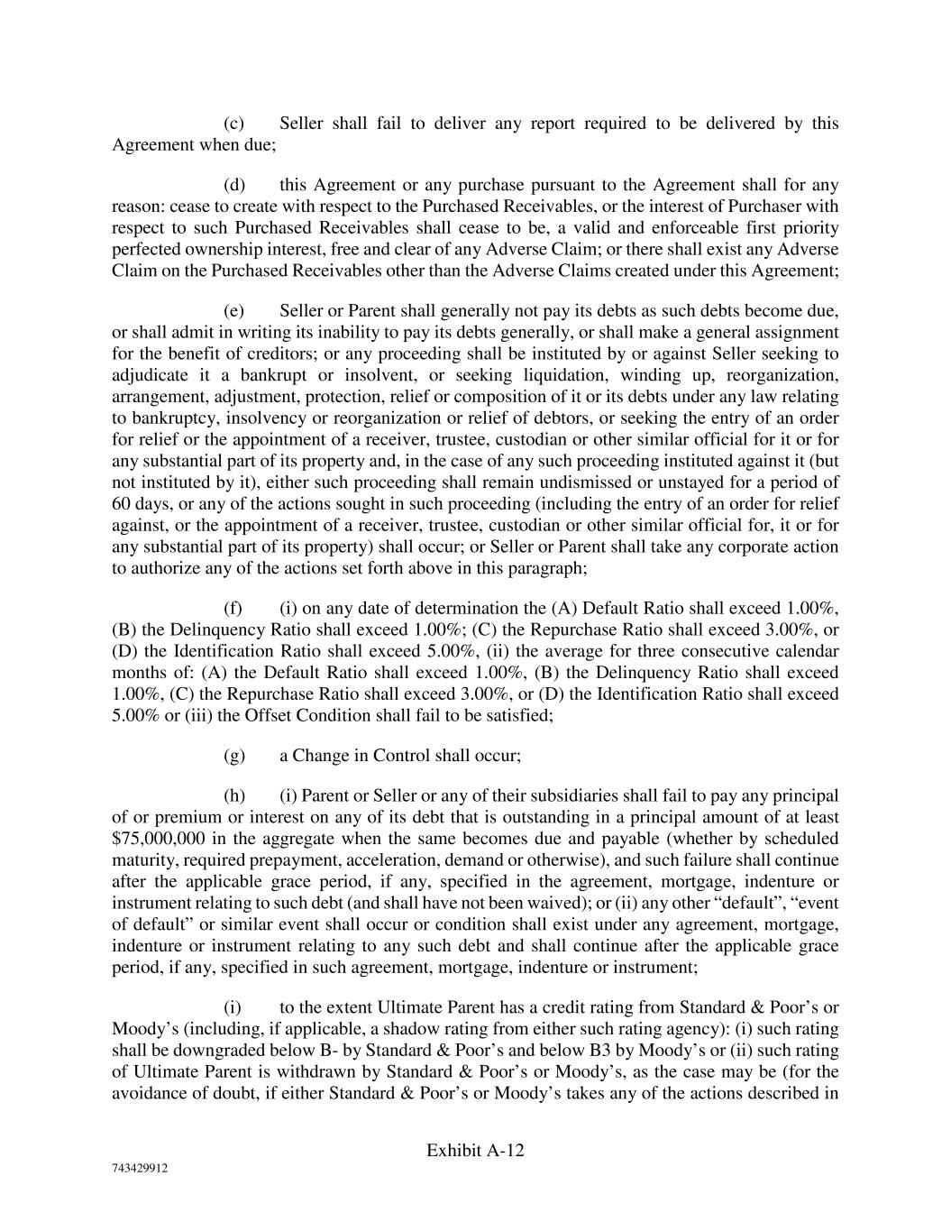 Exhibit A-12 743429912 (c) Seller shall fail to deliver any report required to be delivered by this Agreement when due; (d) this Agreement or any purchase pursuant to the Agreement shall for any reason: cease to create with respect to the Purchased Receivables, or the interest of Purchaser with respect to such Purchased Receivables shall cease to be, a valid and enforceable first priority perfected ownership interest, free and clear of any Adverse Claim; or there shall exist any Adverse Claim on the Purchased Receivables other than the Adverse Claims created under this Agreement; (e) Seller or Parent shall generally not pay its debts as such debts become due, or shall admit in writing its inability to pay its debts generally, or shall make a general assignment for the benefit of creditors; or any proceeding shall be instituted by or against Seller seeking to adjudicate it a bankrupt or insolvent, or seeking liquidation, winding up, reorganization, arrangement, adjustment, protection, relief or composition of it or its debts under any law relating to bankruptcy, insolvency or reorganization or relief of debtors, or seeking the entry of an order for relief or the appointment of a receiver, trustee, custodian or other similar official for it or for any substantial part of its property and, in the case of any such proceeding instituted against it (but not instituted by it), either such proceeding shall remain undismissed or unstayed for a period of 60 days, or any of the actions sought in such proceeding (including the entry of an order for relief against, or the appointment of a receiver, trustee, custodian or other similar official for, it or for any substantial part of its property) shall occur; or Seller or Parent shall take any corporate action to authorize any of the actions set forth above in this paragraph; (f) (i) on any date of determination the (A) Default Ratio shall exceed 1.00%, (B) the Delinquency Ratio shall exceed 1.00%; (C) the Repurchase Ratio shall exceed 3.00%, or (D) the Identification Ratio shall exceed 5.00%, (ii) the average for three consecutive calendar months of: (A) the Default Ratio shall exceed 1.00%, (B) the Delinquency Ratio shall exceed 1.00%, (C) the Repurchase Ratio shall exceed 3.00%, or (D) the Identification Ratio shall exceed 5.00% or (iii) the Offset Condition shall fail to be satisfied; (g) a Change in Control shall occur; (h) (i) Parent or Seller or any of their subsidiaries shall fail to pay any principal of or premium or interest on any of its debt that is outstanding in a principal amount of at least $75,000,000 in the aggregate when the same becomes due and payable (whether by scheduled maturity, required prepayment, acceleration, demand or otherwise), and such failure shall continue after the applicable grace period, if any, specified in the agreement, mortgage, indenture or instrument relating to such debt (and shall have not been waived); or (ii) any other “default”, “event of default” or similar event shall occur or condition shall exist under any agreement, mortgage, indenture or instrument relating to any such debt and shall continue after the applicable grace period, if any, specified in such agreement, mortgage, indenture or instrument; (i) to the extent Ultimate Parent has a credit rating from Standard & Poor’s or Moody’s (including, if applicable, a shadow rating from either such rating agency): (i) such rating shall be downgraded below B- by Standard & Poor’s and below B3 by Moody’s or (ii) such rating of Ultimate Parent is withdrawn by Standard & Poor’s or Moody’s, as the case may be (for the avoidance of doubt, if either Standard & Poor’s or Moody’s takes any of the actions described in