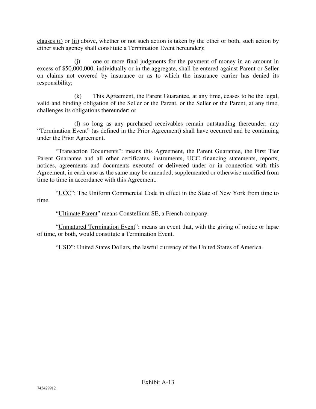 Exhibit A-13 743429912 clauses (i) or (ii) above, whether or not such action is taken by the other or both, such action by either such agency shall constitute a Termination Event hereunder); (j) one or more final judgments for the payment of money in an amount in excess of $50,000,000, individually or in the aggregate, shall be entered against Parent or Seller on claims not covered by insurance or as to which the insurance carrier has denied its responsibility; (k) This Agreement, the Parent Guarantee, at any time, ceases to be the legal, valid and binding obligation of the Seller or the Parent, or the Seller or the Parent, at any time, challenges its obligations thereunder; or (l) so long as any purchased receivables remain outstanding thereunder, any “Termination Event” (as defined in the Prior Agreement) shall have occurred and be continuing under the Prior Agreement. “Transaction Documents”: means this Agreement, the Parent Guarantee, the First Tier Parent Guarantee and all other certificates, instruments, UCC financing statements, reports, notices, agreements and documents executed or delivered under or in connection with this Agreement, in each case as the same may be amended, supplemented or otherwise modified from time to time in accordance with this Agreement. “UCC”: The Uniform Commercial Code in effect in the State of New York from time to time. “Ultimate Parent” means Constellium SE, a French company. “Unmatured Termination Event”: means an event that, with the giving of notice or lapse of time, or both, would constitute a Termination Event. “USD”: United States Dollars, the lawful currency of the United States of America.