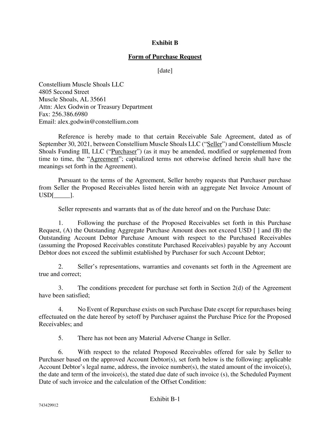 Exhibit B-1 743429912 Exhibit B Form of Purchase Request [date] Constellium Muscle Shoals LLC 4805 Second Street Muscle Shoals, AL 35661 Attn: Alex Godwin or Treasury Department Fax: 256.386.6980 Email: alex.godwin@constellium.com Reference is hereby made to that certain Receivable Sale Agreement, dated as of September 30, 2021, between Constellium Muscle Shoals LLC (“Seller”) and Constellium Muscle Shoals Funding III, LLC (“Purchaser”) (as it may be amended, modified or supplemented from time to time, the “Agreement”; capitalized terms not otherwise defined herein shall have the meanings set forth in the Agreement). Pursuant to the terms of the Agreement, Seller hereby requests that Purchaser purchase from Seller the Proposed Receivables listed herein with an aggregate Net Invoice Amount of USD[_____]. Seller represents and warrants that as of the date hereof and on the Purchase Date: 1. Following the purchase of the Proposed Receivables set forth in this Purchase Request, (A) the Outstanding Aggregate Purchase Amount does not exceed USD [ ] and (B) the Outstanding Account Debtor Purchase Amount with respect to the Purchased Receivables (assuming the Proposed Receivables constitute Purchased Receivables) payable by any Account Debtor does not exceed the sublimit established by Purchaser for such Account Debtor; 2. Seller’s representations, warranties and covenants set forth in the Agreement are true and correct; 3. The conditions precedent for purchase set forth in Section 2(d) of the Agreement have been satisfied; 4. No Event of Repurchase exists on such Purchase Date except for repurchases being effectuated on the date hereof by setoff by Purchaser against the Purchase Price for the Proposed Receivables; and 5. There has not been any Material Adverse Change in Seller. 6. With respect to the related Proposed Receivables offered for sale by Seller to Purchaser based on the approved Account Debtor(s), set forth below is the following: applicable Account Debtor’s legal name, address, the invoice number(s), the stated amount of the invoice(s), the date and term of the invoice(s), the stated due date of such invoice (s), the Scheduled Payment Date of such invoice and the calculation of the Offset Condition: