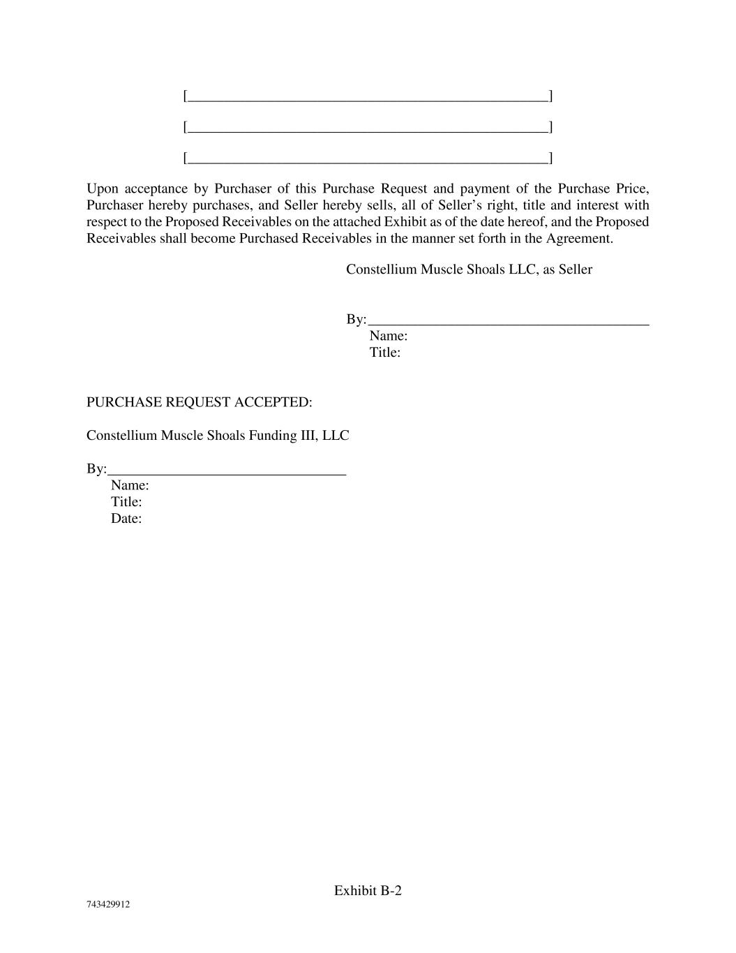 Exhibit B-2 743429912 [__________________________________________________] [__________________________________________________] [__________________________________________________] Upon acceptance by Purchaser of this Purchase Request and payment of the Purchase Price, Purchaser hereby purchases, and Seller hereby sells, all of Seller’s right, title and interest with respect to the Proposed Receivables on the attached Exhibit as of the date hereof, and the Proposed Receivables shall become Purchased Receivables in the manner set forth in the Agreement. Constellium Muscle Shoals LLC, as Seller By: _______________________________________ Name: Title: PURCHASE REQUEST ACCEPTED: Constellium Muscle Shoals Funding III, LLC By: Name: Title: Date: