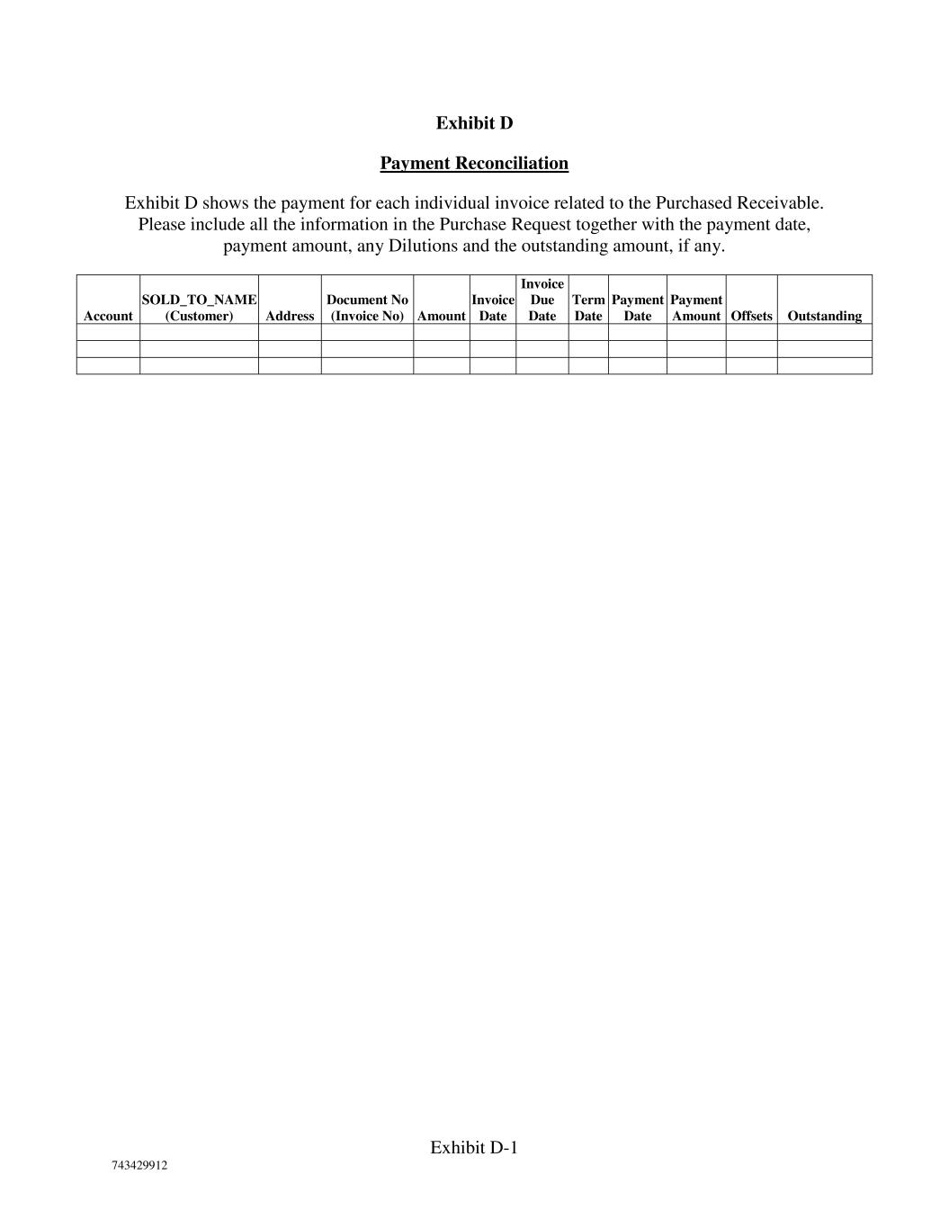 Exhibit D-1 743429912 Exhibit D Payment Reconciliation Exhibit D shows the payment for each individual invoice related to the Purchased Receivable. Please include all the information in the Purchase Request together with the payment date, payment amount, any Dilutions and the outstanding amount, if any. Account SOLD_TO_NAME (Customer) Address Document No (Invoice No) Amount Invoice Date Invoice Due Date Term Date Payment Date Payment Amount Offsets Outstanding