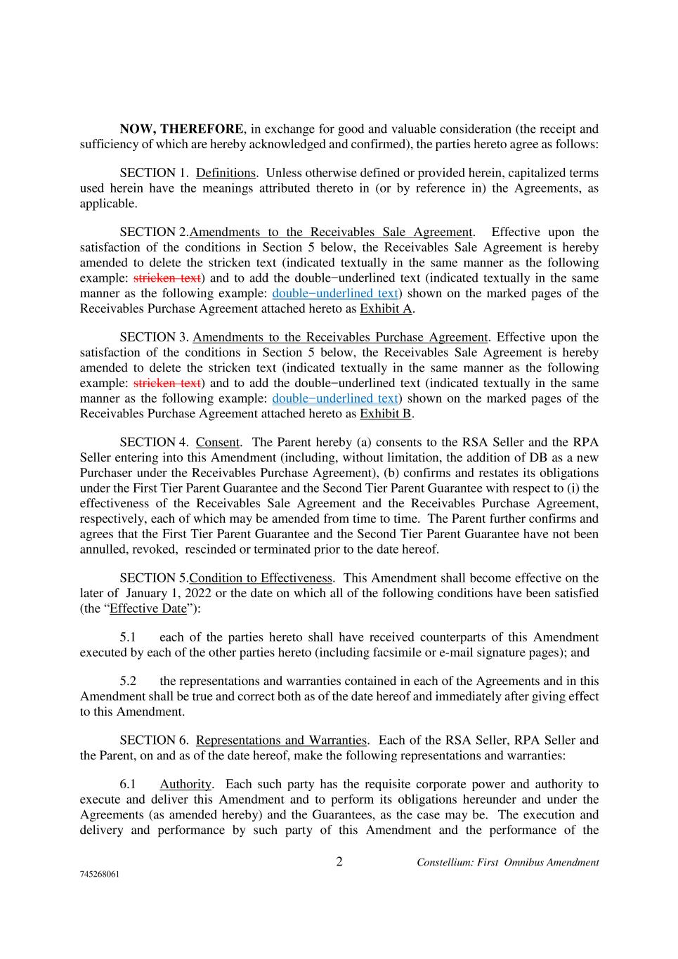 2 Constellium: First Omnibus Amendment 745268061 NOW, THEREFORE, in exchange for good and valuable consideration (the receipt and sufficiency of which are hereby acknowledged and confirmed), the parties hereto agree as follows: SECTION 1. Definitions. Unless otherwise defined or provided herein, capitalized terms used herein have the meanings attributed thereto in (or by reference in) the Agreements, as applicable. SECTION 2.Amendments to the Receivables Sale Agreement. Effective upon the satisfaction of the conditions in Section 5 below, the Receivables Sale Agreement is hereby amended to delete the stricken text (indicated textually in the same manner as the following example: stricken text) and to add the double−underlined text (indicated textually in the same manner as the following example: double−underlined text) shown on the marked pages of the Receivables Purchase Agreement attached hereto as Exhibit A. SECTION 3. Amendments to the Receivables Purchase Agreement. Effective upon the satisfaction of the conditions in Section 5 below, the Receivables Sale Agreement is hereby amended to delete the stricken text (indicated textually in the same manner as the following example: stricken text) and to add the double−underlined text (indicated textually in the same manner as the following example: double−underlined text) shown on the marked pages of the Receivables Purchase Agreement attached hereto as Exhibit B. SECTION 4. Consent. The Parent hereby (a) consents to the RSA Seller and the RPA Seller entering into this Amendment (including, without limitation, the addition of DB as a new Purchaser under the Receivables Purchase Agreement), (b) confirms and restates its obligations under the First Tier Parent Guarantee and the Second Tier Parent Guarantee with respect to (i) the effectiveness of the Receivables Sale Agreement and the Receivables Purchase Agreement, respectively, each of which may be amended from time to time. The Parent further confirms and agrees that the First Tier Parent Guarantee and the Second Tier Parent Guarantee have not been annulled, revoked, rescinded or terminated prior to the date hereof. SECTION 5.Condition to Effectiveness. This Amendment shall become effective on the later of January 1, 2022 or the date on which all of the following conditions have been satisfied (the “Effective Date”): 5.1 each of the parties hereto shall have received counterparts of this Amendment executed by each of the other parties hereto (including facsimile or e-mail signature pages); and 5.2 the representations and warranties contained in each of the Agreements and in this Amendment shall be true and correct both as of the date hereof and immediately after giving effect to this Amendment. SECTION 6. Representations and Warranties. Each of the RSA Seller, RPA Seller and the Parent, on and as of the date hereof, make the following representations and warranties: 6.1 Authority. Each such party has the requisite corporate power and authority to execute and deliver this Amendment and to perform its obligations hereunder and under the Agreements (as amended hereby) and the Guarantees, as the case may be. The execution and delivery and performance by such party of this Amendment and the performance of the