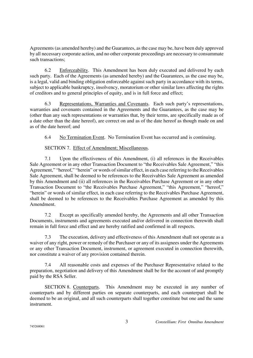 3 Constellium: First Omnibus Amendment 745268061 Agreements (as amended hereby) and the Guarantees, as the case may be, have been duly approved by all necessary corporate action, and no other corporate proceedings are necessary to consummate such transactions; 6.2 Enforceability. This Amendment has been duly executed and delivered by each such party. Each of the Agreements (as amended hereby) and the Guarantees, as the case may be, is a legal, valid and binding obligation enforceable against such party in accordance with its terms, subject to applicable bankruptcy, insolvency, moratorium or other similar laws affecting the rights of creditors and to general principles of equity, and is in full force and effect; 6.3 Representations, Warranties and Covenants. Each such party’s representations, warranties and covenants contained in the Agreements and the Guarantees, as the case may be (other than any such representations or warranties that, by their terms, are specifically made as of a date other than the date hereof), are correct on and as of the date hereof as though made on and as of the date hereof; and 6.4 No Termination Event. No Termination Event has occurred and is continuing. SECTION 7. Effect of Amendment; Miscellaneous. 7.1 Upon the effectiveness of this Amendment, (i) all references in the Receivables Sale Agreement or in any other Transaction Document to “the Receivables Sale Agreement,” “this Agreement,” “hereof,” “herein” or words of similar effect, in each case referring to the Receivables Sale Agreement, shall be deemed to be references to the Receivables Sale Agreement as amended by this Amendment and (ii) all references in the Receivables Purchase Agreement or in any other Transaction Document to “the Receivables Purchase Agreement,” “this Agreement,” “hereof,” “herein” or words of similar effect, in each case referring to the Receivables Purchase Agreement, shall be deemed to be references to the Receivables Purchase Agreement as amended by this Amendment. 7.2 Except as specifically amended hereby, the Agreements and all other Transaction Documents, instruments and agreements executed and/or delivered in connection therewith shall remain in full force and effect and are hereby ratified and confirmed in all respects. 7.3 The execution, delivery and effectiveness of this Amendment shall not operate as a waiver of any right, power or remedy of the Purchaser or any of its assignees under the Agreements or any other Transaction Document, instrument, or agreement executed in connection therewith, nor constitute a waiver of any provision contained therein. 7.4 All reasonable costs and expenses of the Purchaser Representative related to the preparation, negotiation and delivery of this Amendment shall be for the account of and promptly paid by the RSA Seller. SECTION 8. Counterparts. This Amendment may be executed in any number of counterparts and by different parties on separate counterparts, and each counterpart shall be deemed to be an original, and all such counterparts shall together constitute but one and the same instrument.