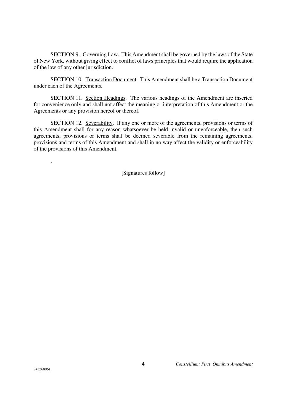 4 Constellium: First Omnibus Amendment 745268061 SECTION 9. Governing Law. This Amendment shall be governed by the laws of the State of New York, without giving effect to conflict of laws principles that would require the application of the law of any other jurisdiction. SECTION 10. Transaction Document. This Amendment shall be a Transaction Document under each of the Agreements. SECTION 11. Section Headings. The various headings of the Amendment are inserted for convenience only and shall not affect the meaning or interpretation of this Amendment or the Agreements or any provision hereof or thereof. SECTION 12. Severability. If any one or more of the agreements, provisions or terms of this Amendment shall for any reason whatsoever be held invalid or unenforceable, then such agreements, provisions or terms shall be deemed severable from the remaining agreements, provisions and terms of this Amendment and shall in no way affect the validity or enforceability of the provisions of this Amendment. . [Signatures follow]