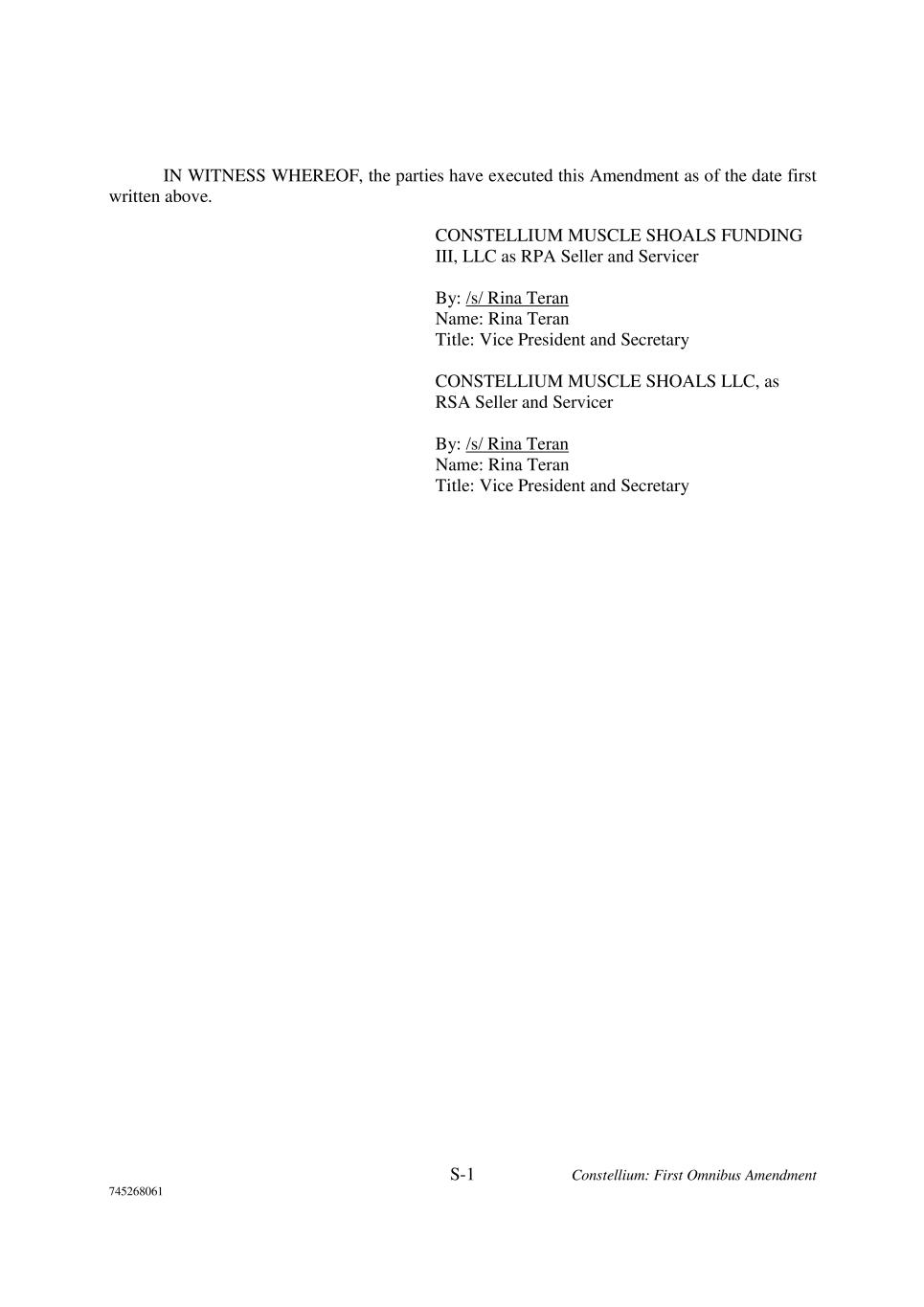 S-1 Constellium: First Omnibus Amendment 745268061 IN WITNESS WHEREOF, the parties have executed this Amendment as of the date first written above. CONSTELLIUM MUSCLE SHOALS FUNDING III, LLC as RPA Seller and Servicer By: /s/ Rina Teran Name: Rina Teran Title: Vice President and Secretary CONSTELLIUM MUSCLE SHOALS LLC, as RSA Seller and Servicer By: /s/ Rina Teran Name: Rina Teran Title: Vice President and Secretary