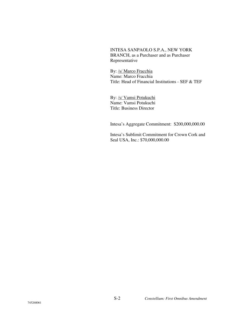 S-2 Constellium: First Omnibus Amendment 745268061 INTESA SANPAOLO S.P.A., NEW YORK BRANCH, as a Purchaser and as Purchaser Representative By: /s/ Marco Fracchia Name: Marco Fracchia Title: Head of Financial Institutions - SEF & TEF By: /s/ Vamsi Potukuchi Name: Vamsi Potukuchi Title: Business Director Intesa’s Aggregate Commitment: $200,000,000.00 Intesa’s Sublimit Commitment for Crown Cork and Seal USA, Inc.: $70,000,000.00