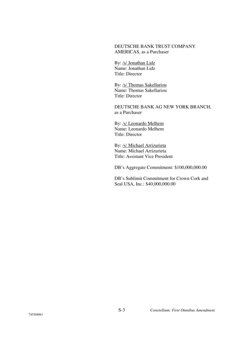 S-3 Constellium: First Omnibus Amendment 745268061 DEUTSCHE BANK TRUST COMPANY AMERICAS, as a Purchaser By: /s/ Jonathan Lidz Name: Jonathan Lidz Title: Director By: /s/ Thomas Sakellariou Name: Thomas Sakellariou Title: Director DEUTSCHE BANK AG NEW YORK BRANCH, as a Purchaser By: /s/ Leonardo Melhem Name: Leonardo Melhem Title: Director By: /s/ Michael Arrizurieta Name: Michael Arrizurieta Title: Assistant Vice President DB’s Aggregate Commitment: $100,000,000.00 DB’s Sublimit Commitment for Crown Cork and Seal USA, Inc.: $40,000,000.00