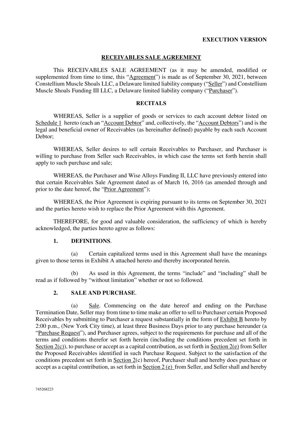 EXECUTION VERSION 745268223 RECEIVABLES SALE AGREEMENT This RECEIVABLES SALE AGREEMENT (as it may be amended, modified or supplemented from time to time, this “Agreement”) is made as of September 30, 2021, between Constellium Muscle Shoals LLC, a Delaware limited liability company (“Seller”) and Constellium Muscle Shoals Funding III LLC, a Delaware limited liability company (“Purchaser”). RECITALS WHEREAS, Seller is a supplier of goods or services to each account debtor listed on Schedule 1 hereto (each an “Account Debtor” and, collectively, the “Account Debtors”) and is the legal and beneficial owner of Receivables (as hereinafter defined) payable by each such Account Debtor; WHEREAS, Seller desires to sell certain Receivables to Purchaser, and Purchaser is willing to purchase from Seller such Receivables, in which case the terms set forth herein shall apply to such purchase and sale; WHEREAS, the Purchaser and Wise Alloys Funding II, LLC have previously entered into that certain Receivables Sale Agreement dated as of March 16, 2016 (as amended through and prior to the date hereof, the “Prior Agreement”); WHEREAS, the Prior Agreement is expiring pursuant to its terms on September 30, 2021 and the parties hereto wish to replace the Prior Agreement with this Agreement. THEREFORE, for good and valuable consideration, the sufficiency of which is hereby acknowledged, the parties hereto agree as follows: 1. DEFINITIONS. (a) Certain capitalized terms used in this Agreement shall have the meanings given to those terms in Exhibit A attached hereto and thereby incorporated herein. (b) As used in this Agreement, the terms “include” and “including” shall be read as if followed by “without limitation” whether or not so followed. 2. SALE AND PURCHASE. (a) Sale. Commencing on the date hereof and ending on the Purchase Termination Date, Seller may from time to time make an offer to sell to Purchaser certain Proposed Receivables by submitting to Purchaser a request substantially in the form of Exhibit B hereto by 2:00 p.m., (New York City time), at least three Business Days prior to any purchase hereunder (a “Purchase Request”), and Purchaser agrees, subject to the requirements for purchase and all of the terms and conditions therefor set forth herein (including the conditions precedent set forth in Section 2(c)), to purchase or accept as a capital contribution, as set forth in Section 2(e) from Seller the Proposed Receivables identified in such Purchase Request. Subject to the satisfaction of the conditions precedent set forth in Section 2(c) hereof, Purchaser shall and hereby does purchase or accept as a capital contribution, as set forth in Section 2 (e) from Seller, and Seller shall and hereby