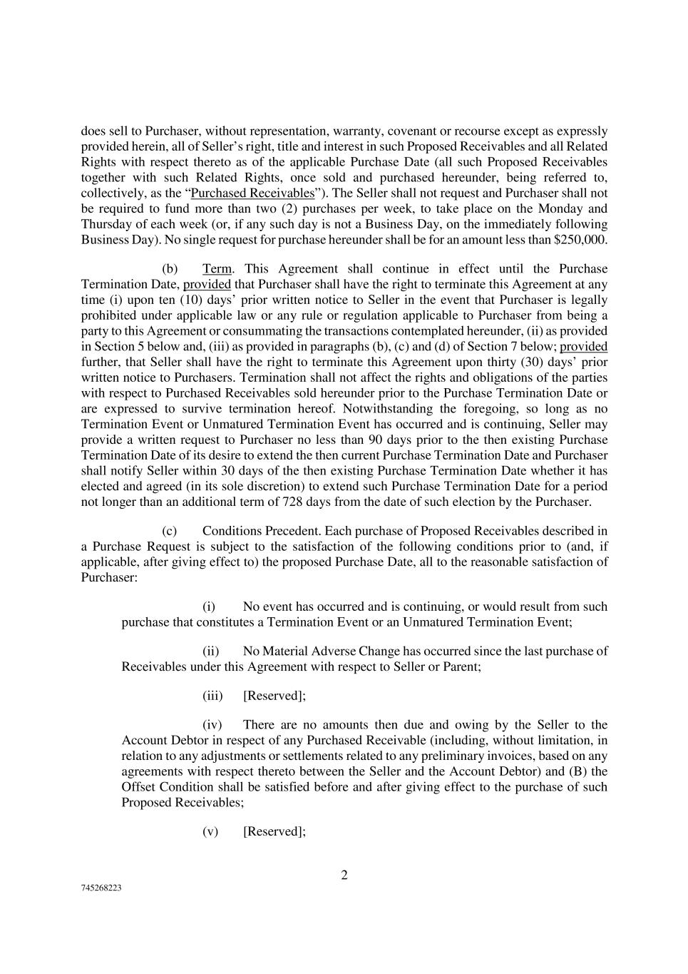 2 745268223 does sell to Purchaser, without representation, warranty, covenant or recourse except as expressly provided herein, all of Seller’s right, title and interest in such Proposed Receivables and all Related Rights with respect thereto as of the applicable Purchase Date (all such Proposed Receivables together with such Related Rights, once sold and purchased hereunder, being referred to, collectively, as the “Purchased Receivables”). The Seller shall not request and Purchaser shall not be required to fund more than two (2) purchases per week, to take place on the Monday and Thursday of each week (or, if any such day is not a Business Day, on the immediately following Business Day). No single request for purchase hereunder shall be for an amount less than $250,000. (b) Term. This Agreement shall continue in effect until the Purchase Termination Date, provided that Purchaser shall have the right to terminate this Agreement at any time (i) upon ten (10) days’ prior written notice to Seller in the event that Purchaser is legally prohibited under applicable law or any rule or regulation applicable to Purchaser from being a party to this Agreement or consummating the transactions contemplated hereunder, (ii) as provided in Section 5 below and, (iii) as provided in paragraphs (b), (c) and (d) of Section 7 below; provided further, that Seller shall have the right to terminate this Agreement upon thirty (30) days’ prior written notice to Purchasers. Termination shall not affect the rights and obligations of the parties with respect to Purchased Receivables sold hereunder prior to the Purchase Termination Date or are expressed to survive termination hereof. Notwithstanding the foregoing, so long as no Termination Event or Unmatured Termination Event has occurred and is continuing, Seller may provide a written request to Purchaser no less than 90 days prior to the then existing Purchase Termination Date of its desire to extend the then current Purchase Termination Date and Purchaser shall notify Seller within 30 days of the then existing Purchase Termination Date whether it has elected and agreed (in its sole discretion) to extend such Purchase Termination Date for a period not longer than an additional term of 728 days from the date of such election by the Purchaser. (c) Conditions Precedent. Each purchase of Proposed Receivables described in a Purchase Request is subject to the satisfaction of the following conditions prior to (and, if applicable, after giving effect to) the proposed Purchase Date, all to the reasonable satisfaction of Purchaser: (i) No event has occurred and is continuing, or would result from such purchase that constitutes a Termination Event or an Unmatured Termination Event; (ii) No Material Adverse Change has occurred since the last purchase of Receivables under this Agreement with respect to Seller or Parent; (iii) [Reserved]; (iv) There are no amounts then due and owing by the Seller to the Account Debtor in respect of any Purchased Receivable (including, without limitation, in relation to any adjustments or settlements related to any preliminary invoices, based on any agreements with respect thereto between the Seller and the Account Debtor) and (B) the Offset Condition shall be satisfied before and after giving effect to the purchase of such Proposed Receivables; (v) [Reserved];