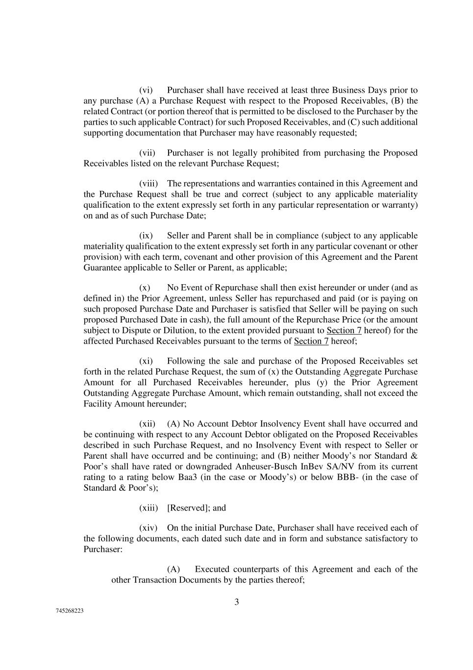 3 745268223 (vi) Purchaser shall have received at least three Business Days prior to any purchase (A) a Purchase Request with respect to the Proposed Receivables, (B) the related Contract (or portion thereof that is permitted to be disclosed to the Purchaser by the parties to such applicable Contract) for such Proposed Receivables, and (C) such additional supporting documentation that Purchaser may have reasonably requested; (vii) Purchaser is not legally prohibited from purchasing the Proposed Receivables listed on the relevant Purchase Request; (viii) The representations and warranties contained in this Agreement and the Purchase Request shall be true and correct (subject to any applicable materiality qualification to the extent expressly set forth in any particular representation or warranty) on and as of such Purchase Date; (ix) Seller and Parent shall be in compliance (subject to any applicable materiality qualification to the extent expressly set forth in any particular covenant or other provision) with each term, covenant and other provision of this Agreement and the Parent Guarantee applicable to Seller or Parent, as applicable; (x) No Event of Repurchase shall then exist hereunder or under (and as defined in) the Prior Agreement, unless Seller has repurchased and paid (or is paying on such proposed Purchase Date and Purchaser is satisfied that Seller will be paying on such proposed Purchased Date in cash), the full amount of the Repurchase Price (or the amount subject to Dispute or Dilution, to the extent provided pursuant to Section 7 hereof) for the affected Purchased Receivables pursuant to the terms of Section 7 hereof; (xi) Following the sale and purchase of the Proposed Receivables set forth in the related Purchase Request, the sum of (x) the Outstanding Aggregate Purchase Amount for all Purchased Receivables hereunder, plus (y) the Prior Agreement Outstanding Aggregate Purchase Amount, which remain outstanding, shall not exceed the Facility Amount hereunder; (xii) (A) No Account Debtor Insolvency Event shall have occurred and be continuing with respect to any Account Debtor obligated on the Proposed Receivables described in such Purchase Request, and no Insolvency Event with respect to Seller or Parent shall have occurred and be continuing; and (B) neither Moody’s nor Standard & Poor’s shall have rated or downgraded Anheuser-Busch InBev SA/NV from its current rating to a rating below Baa3 (in the case or Moody’s) or below BBB- (in the case of Standard & Poor’s); (xiii) [Reserved]; and (xiv) On the initial Purchase Date, Purchaser shall have received each of the following documents, each dated such date and in form and substance satisfactory to Purchaser: (A) Executed counterparts of this Agreement and each of the other Transaction Documents by the parties thereof;