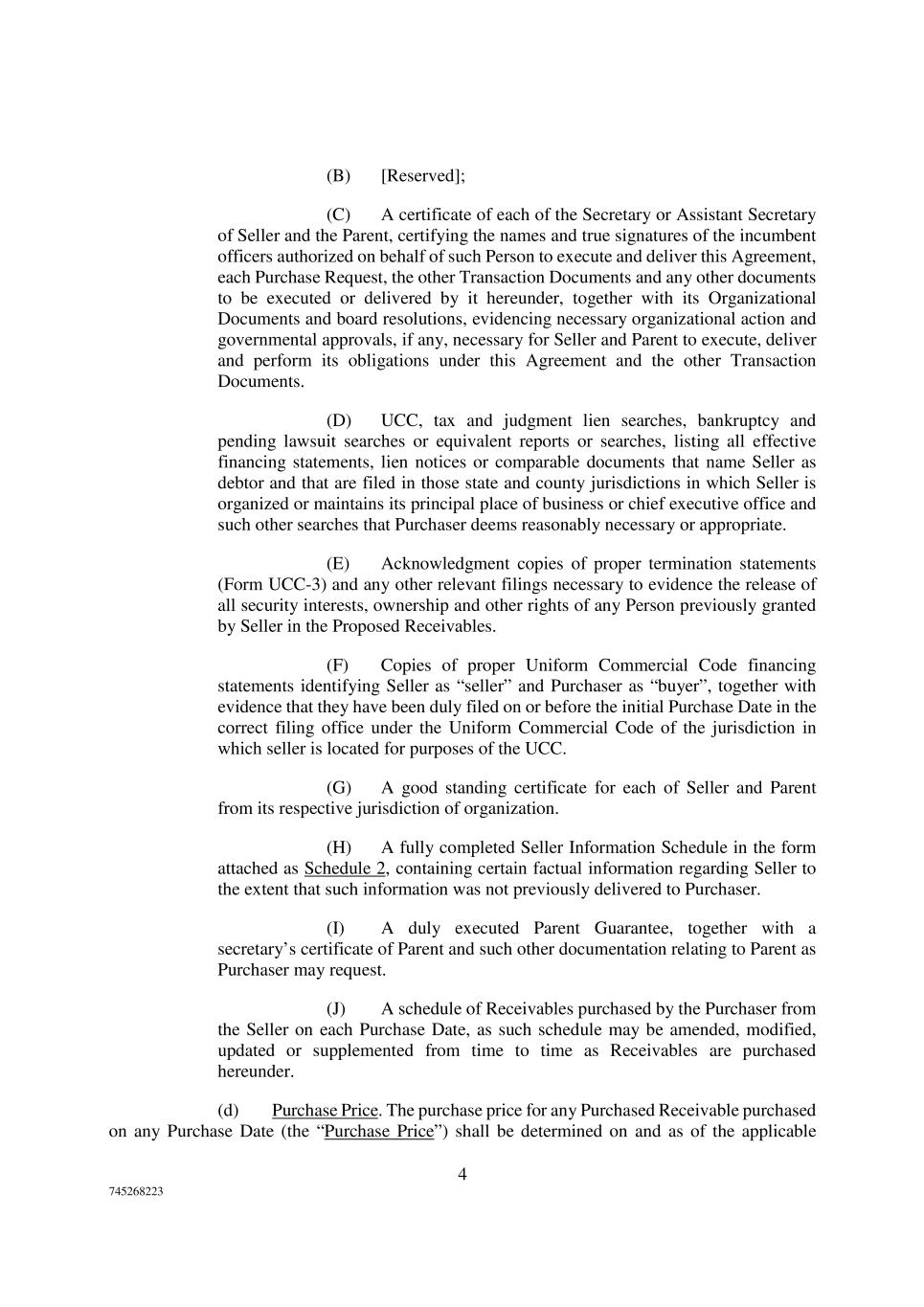 4 745268223 (B) [Reserved]; (C) A certificate of each of the Secretary or Assistant Secretary of Seller and the Parent, certifying the names and true signatures of the incumbent officers authorized on behalf of such Person to execute and deliver this Agreement, each Purchase Request, the other Transaction Documents and any other documents to be executed or delivered by it hereunder, together with its Organizational Documents and board resolutions, evidencing necessary organizational action and governmental approvals, if any, necessary for Seller and Parent to execute, deliver and perform its obligations under this Agreement and the other Transaction Documents. (D) UCC, tax and judgment lien searches, bankruptcy and pending lawsuit searches or equivalent reports or searches, listing all effective financing statements, lien notices or comparable documents that name Seller as debtor and that are filed in those state and county jurisdictions in which Seller is organized or maintains its principal place of business or chief executive office and such other searches that Purchaser deems reasonably necessary or appropriate. (E) Acknowledgment copies of proper termination statements (Form UCC-3) and any other relevant filings necessary to evidence the release of all security interests, ownership and other rights of any Person previously granted by Seller in the Proposed Receivables. (F) Copies of proper Uniform Commercial Code financing statements identifying Seller as “seller” and Purchaser as “buyer”, together with evidence that they have been duly filed on or before the initial Purchase Date in the correct filing office under the Uniform Commercial Code of the jurisdiction in which seller is located for purposes of the UCC. (G) A good standing certificate for each of Seller and Parent from its respective jurisdiction of organization. (H) A fully completed Seller Information Schedule in the form attached as Schedule 2, containing certain factual information regarding Seller to the extent that such information was not previously delivered to Purchaser. (I) A duly executed Parent Guarantee, together with a secretary’s certificate of Parent and such other documentation relating to Parent as Purchaser may request. (J) A schedule of Receivables purchased by the Purchaser from the Seller on each Purchase Date, as such schedule may be amended, modified, updated or supplemented from time to time as Receivables are purchased hereunder. (d) Purchase Price. The purchase price for any Purchased Receivable purchased on any Purchase Date (the “Purchase Price”) shall be determined on and as of the applicable