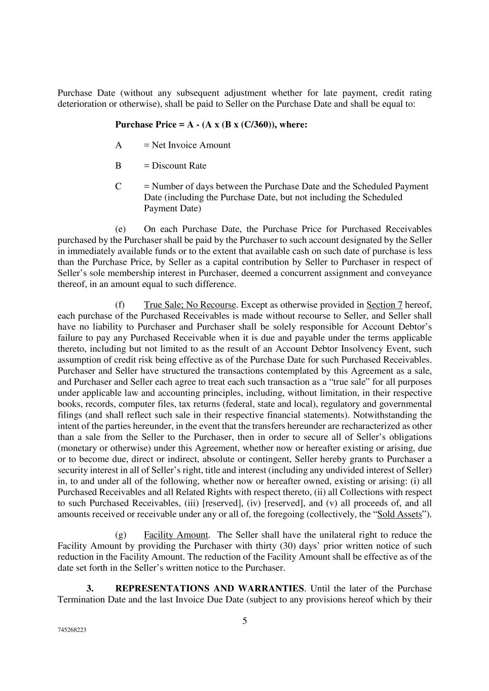 5 745268223 Purchase Date (without any subsequent adjustment whether for late payment, credit rating deterioration or otherwise), shall be paid to Seller on the Purchase Date and shall be equal to: Purchase Price = A - (A x (B x (C/360)), where: A = Net Invoice Amount B = Discount Rate C = Number of days between the Purchase Date and the Scheduled Payment Date (including the Purchase Date, but not including the Scheduled Payment Date) (e) On each Purchase Date, the Purchase Price for Purchased Receivables purchased by the Purchaser shall be paid by the Purchaser to such account designated by the Seller in immediately available funds or to the extent that available cash on such date of purchase is less than the Purchase Price, by Seller as a capital contribution by Seller to Purchaser in respect of Seller’s sole membership interest in Purchaser, deemed a concurrent assignment and conveyance thereof, in an amount equal to such difference. (f) True Sale; No Recourse. Except as otherwise provided in Section 7 hereof, each purchase of the Purchased Receivables is made without recourse to Seller, and Seller shall have no liability to Purchaser and Purchaser shall be solely responsible for Account Debtor’s failure to pay any Purchased Receivable when it is due and payable under the terms applicable thereto, including but not limited to as the result of an Account Debtor Insolvency Event, such assumption of credit risk being effective as of the Purchase Date for such Purchased Receivables. Purchaser and Seller have structured the transactions contemplated by this Agreement as a sale, and Purchaser and Seller each agree to treat each such transaction as a “true sale” for all purposes under applicable law and accounting principles, including, without limitation, in their respective books, records, computer files, tax returns (federal, state and local), regulatory and governmental filings (and shall reflect such sale in their respective financial statements). Notwithstanding the intent of the parties hereunder, in the event that the transfers hereunder are recharacterized as other than a sale from the Seller to the Purchaser, then in order to secure all of Seller’s obligations (monetary or otherwise) under this Agreement, whether now or hereafter existing or arising, due or to become due, direct or indirect, absolute or contingent, Seller hereby grants to Purchaser a security interest in all of Seller’s right, title and interest (including any undivided interest of Seller) in, to and under all of the following, whether now or hereafter owned, existing or arising: (i) all Purchased Receivables and all Related Rights with respect thereto, (ii) all Collections with respect to such Purchased Receivables, (iii) [reserved], (iv) [reserved], and (v) all proceeds of, and all amounts received or receivable under any or all of, the foregoing (collectively, the “Sold Assets”). (g) Facility Amount. The Seller shall have the unilateral right to reduce the Facility Amount by providing the Purchaser with thirty (30) days’ prior written notice of such reduction in the Facility Amount. The reduction of the Facility Amount shall be effective as of the date set forth in the Seller’s written notice to the Purchaser. 3. REPRESENTATIONS AND WARRANTIES. Until the later of the Purchase Termination Date and the last Invoice Due Date (subject to any provisions hereof which by their
