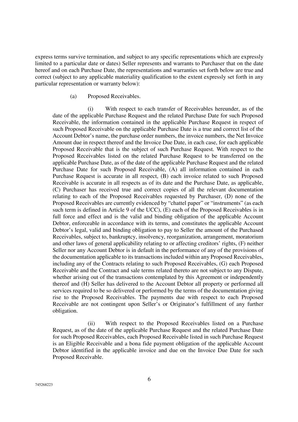 6 745268223 express terms survive termination, and subject to any specific representations which are expressly limited to a particular date or dates) Seller represents and warrants to Purchaser that on the date hereof and on each Purchase Date, the representations and warranties set forth below are true and correct (subject to any applicable materiality qualification to the extent expressly set forth in any particular representation or warranty below): (a) Proposed Receivables. (i) With respect to each transfer of Receivables hereunder, as of the date of the applicable Purchase Request and the related Purchase Date for such Proposed Receivable, the information contained in the applicable Purchase Request in respect of such Proposed Receivable on the applicable Purchase Date is a true and correct list of the Account Debtor’s name, the purchase order numbers, the invoice numbers, the Net Invoice Amount due in respect thereof and the Invoice Due Date, in each case, for each applicable Proposed Receivable that is the subject of such Purchase Request. With respect to the Proposed Receivables listed on the related Purchase Request to be transferred on the applicable Purchase Date, as of the date of the applicable Purchase Request and the related Purchase Date for such Proposed Receivable, (A) all information contained in each Purchase Request is accurate in all respect, (B) each invoice related to such Proposed Receivable is accurate in all respects as of its date and the Purchase Date, as applicable, (C) Purchaser has received true and correct copies of all the relevant documentation relating to each of the Proposed Receivables requested by Purchaser, (D) none of the Proposed Receivables are currently evidenced by “chattel paper” or “instruments” (as each such term is defined in Article 9 of the UCC), (E) each of the Proposed Receivables is in full force and effect and is the valid and binding obligation of the applicable Account Debtor, enforceable in accordance with its terms, and constitutes the applicable Account Debtor’s legal, valid and binding obligation to pay to Seller the amount of the Purchased Receivables, subject to, bankruptcy, insolvency, reorganization, arrangement, moratorium and other laws of general applicability relating to or affecting creditors’ rights, (F) neither Seller nor any Account Debtor is in default in the performance of any of the provisions of the documentation applicable to its transactions included within any Proposed Receivables, including any of the Contracts relating to such Proposed Receivables, (G) each Proposed Receivable and the Contract and sale terms related thereto are not subject to any Dispute, whether arising out of the transactions contemplated by this Agreement or independently thereof and (H) Seller has delivered to the Account Debtor all property or performed all services required to be so delivered or performed by the terms of the documentation giving rise to the Proposed Receivables. The payments due with respect to each Proposed Receivable are not contingent upon Seller’s or Originator’s fulfillment of any further obligation. (ii) With respect to the Proposed Receivables listed on a Purchase Request, as of the date of the applicable Purchase Request and the related Purchase Date for such Proposed Receivables, each Proposed Receivable listed in such Purchase Request is an Eligible Receivable and a bona fide payment obligation of the applicable Account Debtor identified in the applicable invoice and due on the Invoice Due Date for such Proposed Receivable.