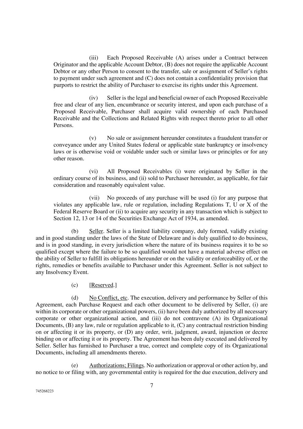 7 745268223 (iii) Each Proposed Receivable (A) arises under a Contract between Originator and the applicable Account Debtor, (B) does not require the applicable Account Debtor or any other Person to consent to the transfer, sale or assignment of Seller’s rights to payment under such agreement and (C) does not contain a confidentiality provision that purports to restrict the ability of Purchaser to exercise its rights under this Agreement. (iv) Seller is the legal and beneficial owner of each Proposed Receivable free and clear of any lien, encumbrance or security interest, and upon each purchase of a Proposed Receivable, Purchaser shall acquire valid ownership of each Purchased Receivable and the Collections and Related Rights with respect thereto prior to all other Persons. (v) No sale or assignment hereunder constitutes a fraudulent transfer or conveyance under any United States federal or applicable state bankruptcy or insolvency laws or is otherwise void or voidable under such or similar laws or principles or for any other reason. (vi) All Proposed Receivables (i) were originated by Seller in the ordinary course of its business, and (ii) sold to Purchaser hereunder, as applicable, for fair consideration and reasonably equivalent value. (vii) No proceeds of any purchase will be used (i) for any purpose that violates any applicable law, rule or regulation, including Regulations T, U or X of the Federal Reserve Board or (ii) to acquire any security in any transaction which is subject to Section 12, 13 or 14 of the Securities Exchange Act of 1934, as amended. (b) Seller. Seller is a limited liability company, duly formed, validly existing and in good standing under the laws of the State of Delaware and is duly qualified to do business, and is in good standing, in every jurisdiction where the nature of its business requires it to be so qualified except where the failure to be so qualified would not have a material adverse effect on the ability of Seller to fulfill its obligations hereunder or on the validity or enforceability of, or the rights, remedies or benefits available to Purchaser under this Agreement. Seller is not subject to any Insolvency Event. (c) [Reserved.] (d) No Conflict, etc. The execution, delivery and performance by Seller of this Agreement, each Purchase Request and each other document to be delivered by Seller, (i) are within its corporate or other organizational powers, (ii) have been duly authorized by all necessary corporate or other organizational action, and (iii) do not contravene (A) its Organizational Documents, (B) any law, rule or regulation applicable to it, (C) any contractual restriction binding on or affecting it or its property, or (D) any order, writ, judgment, award, injunction or decree binding on or affecting it or its property. The Agreement has been duly executed and delivered by Seller. Seller has furnished to Purchaser a true, correct and complete copy of its Organizational Documents, including all amendments thereto. (e) Authorizations; Filings. No authorization or approval or other action by, and no notice to or filing with, any governmental entity is required for the due execution, delivery and