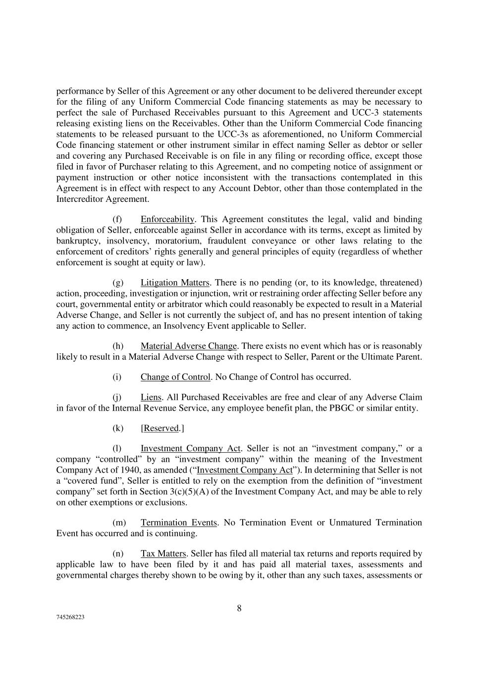 8 745268223 performance by Seller of this Agreement or any other document to be delivered thereunder except for the filing of any Uniform Commercial Code financing statements as may be necessary to perfect the sale of Purchased Receivables pursuant to this Agreement and UCC-3 statements releasing existing liens on the Receivables. Other than the Uniform Commercial Code financing statements to be released pursuant to the UCC-3s as aforementioned, no Uniform Commercial Code financing statement or other instrument similar in effect naming Seller as debtor or seller and covering any Purchased Receivable is on file in any filing or recording office, except those filed in favor of Purchaser relating to this Agreement, and no competing notice of assignment or payment instruction or other notice inconsistent with the transactions contemplated in this Agreement is in effect with respect to any Account Debtor, other than those contemplated in the Intercreditor Agreement. (f) Enforceability. This Agreement constitutes the legal, valid and binding obligation of Seller, enforceable against Seller in accordance with its terms, except as limited by bankruptcy, insolvency, moratorium, fraudulent conveyance or other laws relating to the enforcement of creditors’ rights generally and general principles of equity (regardless of whether enforcement is sought at equity or law). (g) Litigation Matters. There is no pending (or, to its knowledge, threatened) action, proceeding, investigation or injunction, writ or restraining order affecting Seller before any court, governmental entity or arbitrator which could reasonably be expected to result in a Material Adverse Change, and Seller is not currently the subject of, and has no present intention of taking any action to commence, an Insolvency Event applicable to Seller. (h) Material Adverse Change. There exists no event which has or is reasonably likely to result in a Material Adverse Change with respect to Seller, Parent or the Ultimate Parent. (i) Change of Control. No Change of Control has occurred. (j) Liens. All Purchased Receivables are free and clear of any Adverse Claim in favor of the Internal Revenue Service, any employee benefit plan, the PBGC or similar entity. (k) [Reserved.] (l) Investment Company Act. Seller is not an “investment company,” or a company “controlled” by an “investment company” within the meaning of the Investment Company Act of 1940, as amended (“Investment Company Act”). In determining that Seller is not a “covered fund”, Seller is entitled to rely on the exemption from the definition of “investment company” set forth in Section 3(c)(5)(A) of the Investment Company Act, and may be able to rely on other exemptions or exclusions. (m) Termination Events. No Termination Event or Unmatured Termination Event has occurred and is continuing. (n) Tax Matters. Seller has filed all material tax returns and reports required by applicable law to have been filed by it and has paid all material taxes, assessments and governmental charges thereby shown to be owing by it, other than any such taxes, assessments or