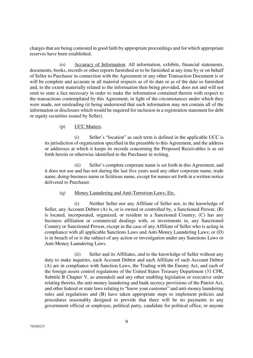 9 745268223 charges that are being contested in good faith by appropriate proceedings and for which appropriate reserves have been established. (o) Accuracy of Information. All information, exhibits, financial statements, documents, books, records or other reports furnished or to be furnished at any time by or on behalf of Seller to Purchaser in connection with the Agreement or any other Transaction Document is or will be complete and accurate in all material respects as of its date or as of the date so furnished and, to the extent materially related to the information then being provided, does not and will not omit to state a fact necessary in order to make the information contained therein with respect to the transactions contemplated by this Agreement, in light of the circumstances under which they were made, not misleading (it being understood that such information may not contain all of the information or disclosure which would be required for inclusion in a registration statement for debt or equity securities issued by Seller). (p) UCC Matters. (i) Seller’s “location” as such term is defined in the applicable UCC is its jurisdiction of organization specified in the preamble to this Agreement, and the address or addresses at which it keeps its records concerning the Proposed Receivables is as set forth herein or otherwise identified to the Purchaser in writing. (ii) Seller’s complete corporate name is set forth in this Agreement, and it does not use and has not during the last five years used any other corporate name, trade name, doing-business name or fictitious name, except for names set forth in a written notice delivered to Purchaser. (q) Money Laundering and Anti-Terrorism Laws; Etc. (i) Neither Seller nor any Affiliate of Seller nor, to the knowledge of Seller, any Account Debtor (A) is, or is owned or controlled by, a Sanctioned Person; (B) is located, incorporated, organized, or resident in a Sanctioned Country; (C) has any business affiliation or commercial dealings with, or investments in, any Sanctioned Country or Sanctioned Person, except in the case of any Affiliate of Seller who is acting in compliance with all applicable Sanctions Laws and Anti-Money Laundering Laws; or (D) is in breach of or is the subject of any action or investigation under any Sanctions Laws or Anti-Money Laundering Laws. (ii) Seller and its Affiliates, and to the knowledge of Seller without any duty to make inquiries, each Account Debtor and each Affiliate of such Account Debtor (A) are in compliance with Sanction Laws, the Trading with the Enemy Act, and each of the foreign assets control regulations of the United States Treasury Department (31 CFR, Subtitle B Chapter V, as amended) and any other enabling legislation or executive order relating thereto, the anti-money laundering and bank secrecy provisions of the Patriot Act, and other federal or state laws relating to “know your customer” and anti-money laundering rules and regulations and (B) have taken appropriate steps to implement policies and procedures reasonably designed to provide that there will be no payments to any government official or employee, political party, candidate for political office, or anyone
