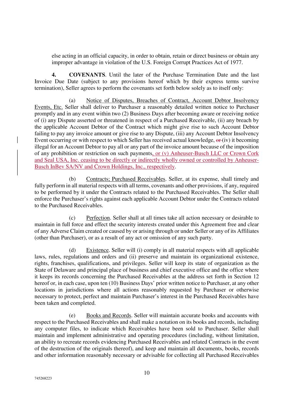 10 745268223 else acting in an official capacity, in order to obtain, retain or direct business or obtain any improper advantage in violation of the U.S. Foreign Corrupt Practices Act of 1977. 4. COVENANTS. Until the later of the Purchase Termination Date and the last Invoice Due Date (subject to any provisions hereof which by their express terms survive termination), Seller agrees to perform the covenants set forth below solely as to itself only: (a) Notice of Disputes, Breaches of Contract, Account Debtor Insolvency Events, Etc. Seller shall deliver to Purchaser a reasonably detailed written notice to Purchaser promptly and in any event within two (2) Business Days after becoming aware or receiving notice of (i) any Dispute asserted or threatened in respect of a Purchased Receivable, (ii) any breach by the applicable Account Debtor of the Contract which might give rise to such Account Debtor failing to pay any invoice amount or give rise to any Dispute, (iii) any Account Debtor Insolvency Event occurring or with respect to which Seller has received actual knowledge, or (iv) it becoming illegal for an Account Debtor to pay all or any part of the invoice amount because of the imposition of any prohibition or restriction on such payments, or (v) Anheuser-Busch LLC or Crown Cork and Seal USA, Inc. ceasing to be directly or indirectly wholly owned or controlled by Anheuser- Busch InBev SA/NV and Crown Holdings, Inc., respectively. (b) Contracts; Purchased Receivables. Seller, at its expense, shall timely and fully perform in all material respects with all terms, covenants and other provisions, if any, required to be performed by it under the Contracts related to the Purchased Receivables. The Seller shall enforce the Purchaser’s rights against each applicable Account Debtor under the Contracts related to the Purchased Receivables. (c) Perfection. Seller shall at all times take all action necessary or desirable to maintain in full force and effect the security interests created under this Agreement free and clear of any Adverse Claim created or caused by or arising through or under Seller or any of its Affiliates (other than Purchaser), or as a result of any act or omission of any such party. (d) Existence. Seller will (i) comply in all material respects with all applicable laws, rules, regulations and orders and (ii) preserve and maintain its organizational existence, rights, franchises, qualifications, and privileges. Seller will keep its state of organization as the State of Delaware and principal place of business and chief executive office and the office where it keeps its records concerning the Purchased Receivables at the address set forth in Section 12 hereof or, in each case, upon ten (10) Business Days’ prior written notice to Purchaser, at any other locations in jurisdictions where all actions reasonably requested by Purchaser or otherwise necessary to protect, perfect and maintain Purchaser’s interest in the Purchased Receivables have been taken and completed. (e) Books and Records. Seller will maintain accurate books and accounts with respect to the Purchased Receivables and shall make a notation on its books and records, including any computer files, to indicate which Receivables have been sold to Purchaser. Seller shall maintain and implement administrative and operating procedures (including, without limitation, an ability to recreate records evidencing Purchased Receivables and related Contracts in the event of the destruction of the originals thereof), and keep and maintain all documents, books, records and other information reasonably necessary or advisable for collecting all Purchased Receivables