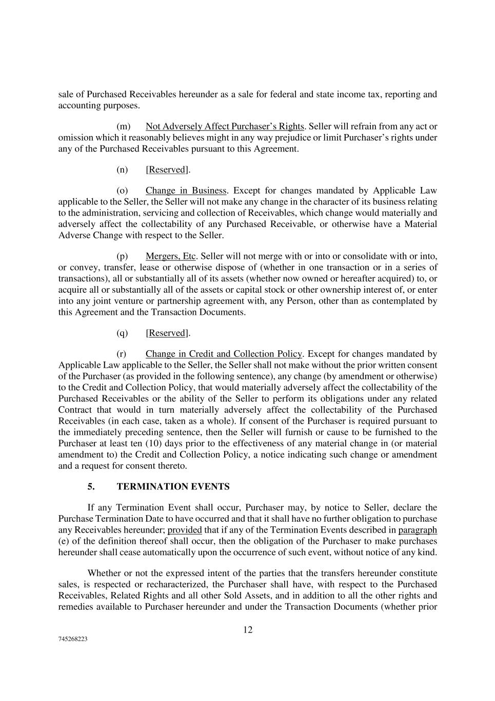 12 745268223 sale of Purchased Receivables hereunder as a sale for federal and state income tax, reporting and accounting purposes. (m) Not Adversely Affect Purchaser’s Rights. Seller will refrain from any act or omission which it reasonably believes might in any way prejudice or limit Purchaser’s rights under any of the Purchased Receivables pursuant to this Agreement. (n) [Reserved]. (o) Change in Business. Except for changes mandated by Applicable Law applicable to the Seller, the Seller will not make any change in the character of its business relating to the administration, servicing and collection of Receivables, which change would materially and adversely affect the collectability of any Purchased Receivable, or otherwise have a Material Adverse Change with respect to the Seller. (p) Mergers, Etc. Seller will not merge with or into or consolidate with or into, or convey, transfer, lease or otherwise dispose of (whether in one transaction or in a series of transactions), all or substantially all of its assets (whether now owned or hereafter acquired) to, or acquire all or substantially all of the assets or capital stock or other ownership interest of, or enter into any joint venture or partnership agreement with, any Person, other than as contemplated by this Agreement and the Transaction Documents. (q) [Reserved]. (r) Change in Credit and Collection Policy. Except for changes mandated by Applicable Law applicable to the Seller, the Seller shall not make without the prior written consent of the Purchaser (as provided in the following sentence), any change (by amendment or otherwise) to the Credit and Collection Policy, that would materially adversely affect the collectability of the Purchased Receivables or the ability of the Seller to perform its obligations under any related Contract that would in turn materially adversely affect the collectability of the Purchased Receivables (in each case, taken as a whole). If consent of the Purchaser is required pursuant to the immediately preceding sentence, then the Seller will furnish or cause to be furnished to the Purchaser at least ten (10) days prior to the effectiveness of any material change in (or material amendment to) the Credit and Collection Policy, a notice indicating such change or amendment and a request for consent thereto. 5. TERMINATION EVENTS If any Termination Event shall occur, Purchaser may, by notice to Seller, declare the Purchase Termination Date to have occurred and that it shall have no further obligation to purchase any Receivables hereunder; provided that if any of the Termination Events described in paragraph (e) of the definition thereof shall occur, then the obligation of the Purchaser to make purchases hereunder shall cease automatically upon the occurrence of such event, without notice of any kind. Whether or not the expressed intent of the parties that the transfers hereunder constitute sales, is respected or recharacterized, the Purchaser shall have, with respect to the Purchased Receivables, Related Rights and all other Sold Assets, and in addition to all the other rights and remedies available to Purchaser hereunder and under the Transaction Documents (whether prior