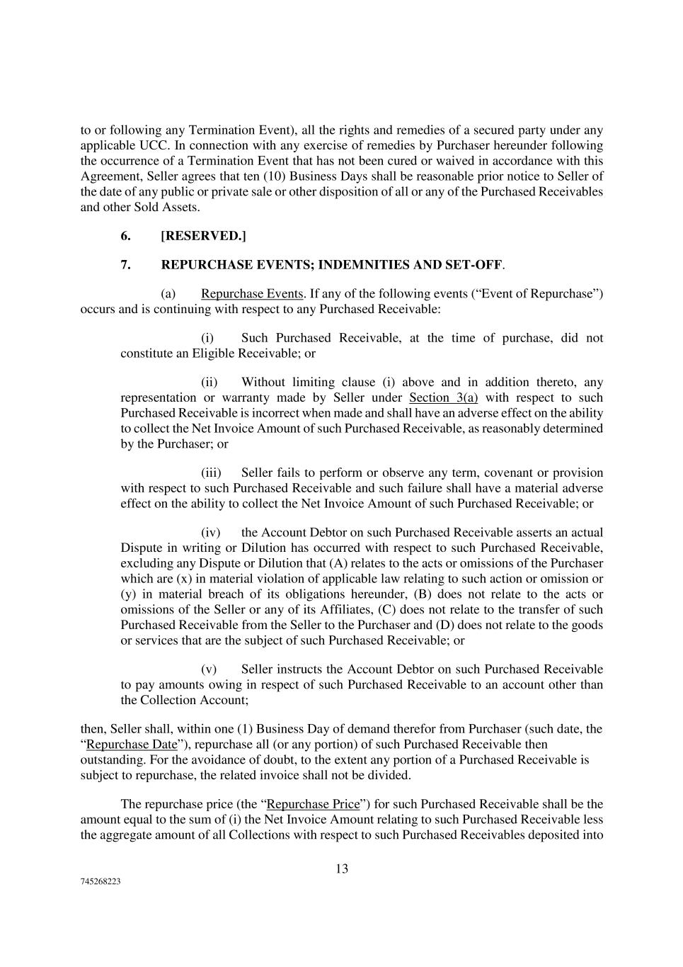 13 745268223 to or following any Termination Event), all the rights and remedies of a secured party under any applicable UCC. In connection with any exercise of remedies by Purchaser hereunder following the occurrence of a Termination Event that has not been cured or waived in accordance with this Agreement, Seller agrees that ten (10) Business Days shall be reasonable prior notice to Seller of the date of any public or private sale or other disposition of all or any of the Purchased Receivables and other Sold Assets. 6. [RESERVED.] 7. REPURCHASE EVENTS; INDEMNITIES AND SET-OFF. (a) Repurchase Events. If any of the following events (“Event of Repurchase”) occurs and is continuing with respect to any Purchased Receivable: (i) Such Purchased Receivable, at the time of purchase, did not constitute an Eligible Receivable; or (ii) Without limiting clause (i) above and in addition thereto, any representation or warranty made by Seller under Section 3(a) with respect to such Purchased Receivable is incorrect when made and shall have an adverse effect on the ability to collect the Net Invoice Amount of such Purchased Receivable, as reasonably determined by the Purchaser; or (iii) Seller fails to perform or observe any term, covenant or provision with respect to such Purchased Receivable and such failure shall have a material adverse effect on the ability to collect the Net Invoice Amount of such Purchased Receivable; or (iv) the Account Debtor on such Purchased Receivable asserts an actual Dispute in writing or Dilution has occurred with respect to such Purchased Receivable, excluding any Dispute or Dilution that (A) relates to the acts or omissions of the Purchaser which are (x) in material violation of applicable law relating to such action or omission or (y) in material breach of its obligations hereunder, (B) does not relate to the acts or omissions of the Seller or any of its Affiliates, (C) does not relate to the transfer of such Purchased Receivable from the Seller to the Purchaser and (D) does not relate to the goods or services that are the subject of such Purchased Receivable; or (v) Seller instructs the Account Debtor on such Purchased Receivable to pay amounts owing in respect of such Purchased Receivable to an account other than the Collection Account; then, Seller shall, within one (1) Business Day of demand therefor from Purchaser (such date, the “Repurchase Date”), repurchase all (or any portion) of such Purchased Receivable then outstanding. For the avoidance of doubt, to the extent any portion of a Purchased Receivable is subject to repurchase, the related invoice shall not be divided. The repurchase price (the “Repurchase Price”) for such Purchased Receivable shall be the amount equal to the sum of (i) the Net Invoice Amount relating to such Purchased Receivable less the aggregate amount of all Collections with respect to such Purchased Receivables deposited into