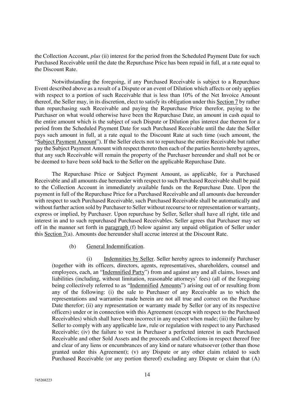 14 745268223 the Collection Account, plus (ii) interest for the period from the Scheduled Payment Date for such Purchased Receivable until the date the Repurchase Price has been repaid in full, at a rate equal to the Discount Rate. Notwithstanding the foregoing, if any Purchased Receivable is subject to a Repurchase Event described above as a result of a Dispute or an event of Dilution which affects or only applies with respect to a portion of such Receivable that is less than 10% of the Net Invoice Amount thereof, the Seller may, in its discretion, elect to satisfy its obligation under this Section 7 by rather than repurchasing such Receivable and paying the Repurchase Price therefor, paying to the Purchaser on what would otherwise have been the Repurchase Date, an amount in cash equal to the entire amount which is the subject of such Dispute or Dilution plus interest due thereon for a period from the Scheduled Payment Date for such Purchased Receivable until the date the Seller pays such amount in full, at a rate equal to the Discount Rate at such time (such amount, the “Subject Payment Amount”). If the Seller elects not to repurchase the entire Receivable but rather pay the Subject Payment Amount with respect thereto then each of the parties hereto hereby agrees, that any such Receivable will remain the property of the Purchaser hereunder and shall not be or be deemed to have been sold back to the Seller on the applicable Repurchase Date. The Repurchase Price or Subject Payment Amount, as applicable, for a Purchased Receivable and all amounts due hereunder with respect to such Purchased Receivable shall be paid to the Collection Account in immediately available funds on the Repurchase Date. Upon the payment in full of the Repurchase Price for a Purchased Receivable and all amounts due hereunder with respect to such Purchased Receivable, such Purchased Receivable shall be automatically and without further action sold by Purchaser to Seller without recourse to or representation or warranty, express or implied, by Purchaser. Upon repurchase by Seller, Seller shall have all right, title and interest in and to such repurchased Purchased Receivables. Seller agrees that Purchaser may set off in the manner set forth in paragraph (f) below against any unpaid obligation of Seller under this Section 7(a). Amounts due hereunder shall accrue interest at the Discount Rate. (b) General Indemnification. (i) Indemnities by Seller. Seller hereby agrees to indemnify Purchaser (together with its officers, directors, agents, representatives, shareholders, counsel and employees, each, an “Indemnified Party”) from and against any and all claims, losses and liabilities (including, without limitation, reasonable attorneys’ fees) (all of the foregoing being collectively referred to as “Indemnified Amounts”) arising out of or resulting from any of the following: (i) the sale to Purchaser of any Receivable as to which the representations and warranties made herein are not all true and correct on the Purchase Date therefor; (ii) any representation or warranty made by Seller (or any of its respective officers) under or in connection with this Agreement (except with respect to the Purchased Receivables) which shall have been incorrect in any respect when made; (iii) the failure by Seller to comply with any applicable law, rule or regulation with respect to any Purchased Receivable; (iv) the failure to vest in Purchaser a perfected interest in each Purchased Receivable and other Sold Assets and the proceeds and Collections in respect thereof free and clear of any liens or encumbrances of any kind or nature whatsoever (other than those granted under this Agreement); (v) any Dispute or any other claim related to such Purchased Receivable (or any portion thereof) excluding any Dispute or claim that (A)