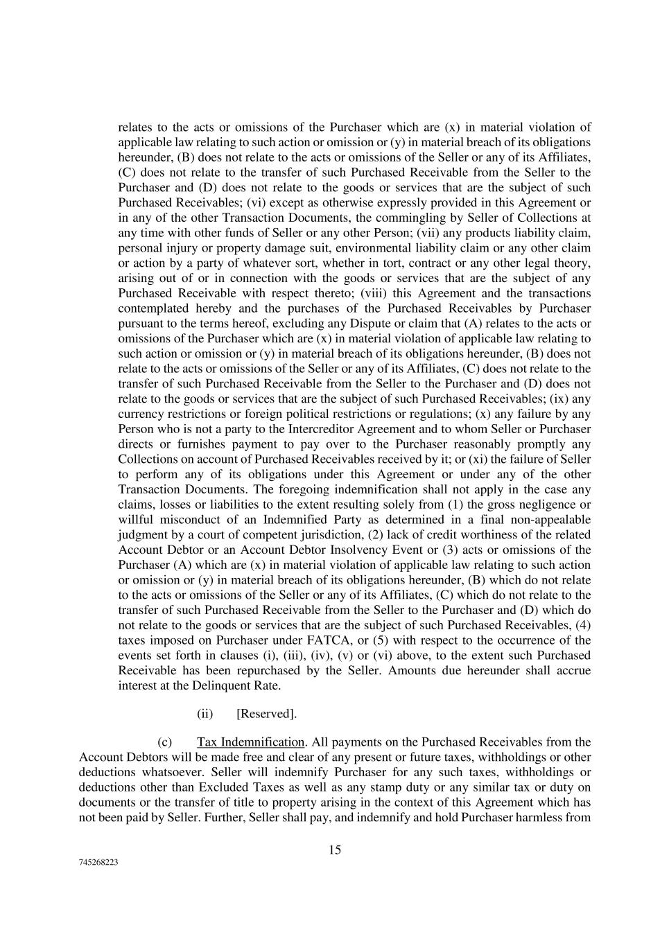 15 745268223 relates to the acts or omissions of the Purchaser which are (x) in material violation of applicable law relating to such action or omission or (y) in material breach of its obligations hereunder, (B) does not relate to the acts or omissions of the Seller or any of its Affiliates, (C) does not relate to the transfer of such Purchased Receivable from the Seller to the Purchaser and (D) does not relate to the goods or services that are the subject of such Purchased Receivables; (vi) except as otherwise expressly provided in this Agreement or in any of the other Transaction Documents, the commingling by Seller of Collections at any time with other funds of Seller or any other Person; (vii) any products liability claim, personal injury or property damage suit, environmental liability claim or any other claim or action by a party of whatever sort, whether in tort, contract or any other legal theory, arising out of or in connection with the goods or services that are the subject of any Purchased Receivable with respect thereto; (viii) this Agreement and the transactions contemplated hereby and the purchases of the Purchased Receivables by Purchaser pursuant to the terms hereof, excluding any Dispute or claim that (A) relates to the acts or omissions of the Purchaser which are (x) in material violation of applicable law relating to such action or omission or (y) in material breach of its obligations hereunder, (B) does not relate to the acts or omissions of the Seller or any of its Affiliates, (C) does not relate to the transfer of such Purchased Receivable from the Seller to the Purchaser and (D) does not relate to the goods or services that are the subject of such Purchased Receivables; (ix) any currency restrictions or foreign political restrictions or regulations; (x) any failure by any Person who is not a party to the Intercreditor Agreement and to whom Seller or Purchaser directs or furnishes payment to pay over to the Purchaser reasonably promptly any Collections on account of Purchased Receivables received by it; or (xi) the failure of Seller to perform any of its obligations under this Agreement or under any of the other Transaction Documents. The foregoing indemnification shall not apply in the case any claims, losses or liabilities to the extent resulting solely from (1) the gross negligence or willful misconduct of an Indemnified Party as determined in a final non-appealable judgment by a court of competent jurisdiction, (2) lack of credit worthiness of the related Account Debtor or an Account Debtor Insolvency Event or (3) acts or omissions of the Purchaser (A) which are (x) in material violation of applicable law relating to such action or omission or (y) in material breach of its obligations hereunder, (B) which do not relate to the acts or omissions of the Seller or any of its Affiliates, (C) which do not relate to the transfer of such Purchased Receivable from the Seller to the Purchaser and (D) which do not relate to the goods or services that are the subject of such Purchased Receivables, (4) taxes imposed on Purchaser under FATCA, or (5) with respect to the occurrence of the events set forth in clauses (i), (iii), (iv), (v) or (vi) above, to the extent such Purchased Receivable has been repurchased by the Seller. Amounts due hereunder shall accrue interest at the Delinquent Rate. (ii) [Reserved]. (c) Tax Indemnification. All payments on the Purchased Receivables from the Account Debtors will be made free and clear of any present or future taxes, withholdings or other deductions whatsoever. Seller will indemnify Purchaser for any such taxes, withholdings or deductions other than Excluded Taxes as well as any stamp duty or any similar tax or duty on documents or the transfer of title to property arising in the context of this Agreement which has not been paid by Seller. Further, Seller shall pay, and indemnify and hold Purchaser harmless from