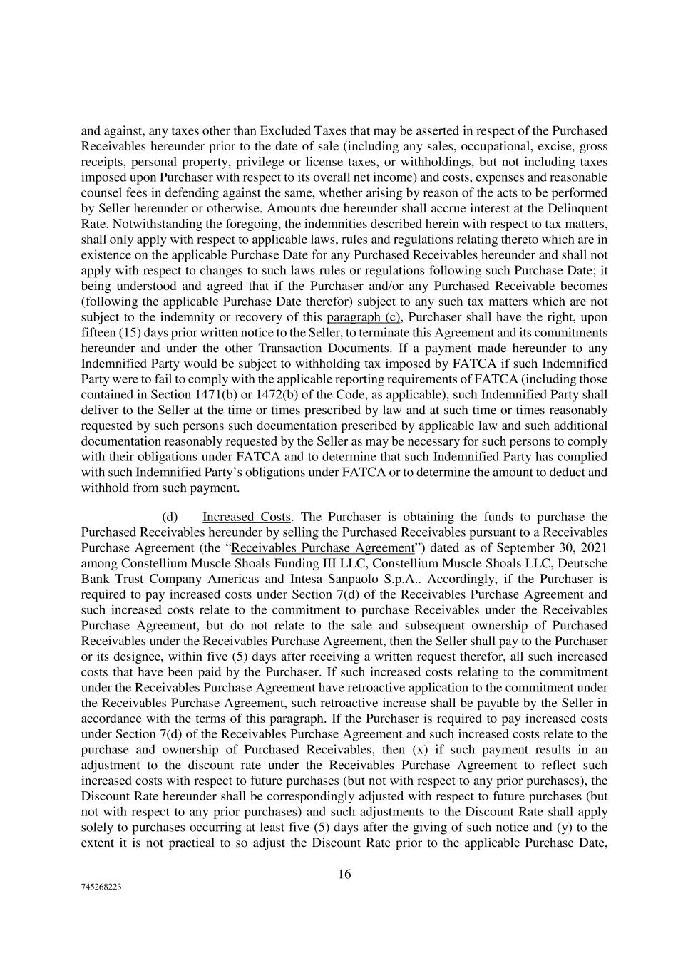 16 745268223 and against, any taxes other than Excluded Taxes that may be asserted in respect of the Purchased Receivables hereunder prior to the date of sale (including any sales, occupational, excise, gross receipts, personal property, privilege or license taxes, or withholdings, but not including taxes imposed upon Purchaser with respect to its overall net income) and costs, expenses and reasonable counsel fees in defending against the same, whether arising by reason of the acts to be performed by Seller hereunder or otherwise. Amounts due hereunder shall accrue interest at the Delinquent Rate. Notwithstanding the foregoing, the indemnities described herein with respect to tax matters, shall only apply with respect to applicable laws, rules and regulations relating thereto which are in existence on the applicable Purchase Date for any Purchased Receivables hereunder and shall not apply with respect to changes to such laws rules or regulations following such Purchase Date; it being understood and agreed that if the Purchaser and/or any Purchased Receivable becomes (following the applicable Purchase Date therefor) subject to any such tax matters which are not subject to the indemnity or recovery of this paragraph (c), Purchaser shall have the right, upon fifteen (15) days prior written notice to the Seller, to terminate this Agreement and its commitments hereunder and under the other Transaction Documents. If a payment made hereunder to any Indemnified Party would be subject to withholding tax imposed by FATCA if such Indemnified Party were to fail to comply with the applicable reporting requirements of FATCA (including those contained in Section 1471(b) or 1472(b) of the Code, as applicable), such Indemnified Party shall deliver to the Seller at the time or times prescribed by law and at such time or times reasonably requested by such persons such documentation prescribed by applicable law and such additional documentation reasonably requested by the Seller as may be necessary for such persons to comply with their obligations under FATCA and to determine that such Indemnified Party has complied with such Indemnified Party’s obligations under FATCA or to determine the amount to deduct and withhold from such payment. (d) Increased Costs. The Purchaser is obtaining the funds to purchase the Purchased Receivables hereunder by selling the Purchased Receivables pursuant to a Receivables Purchase Agreement (the “Receivables Purchase Agreement”) dated as of September 30, 2021 among Constellium Muscle Shoals Funding III LLC, Constellium Muscle Shoals LLC, Deutsche Bank Trust Company Americas and Intesa Sanpaolo S.p.A.. Accordingly, if the Purchaser is required to pay increased costs under Section 7(d) of the Receivables Purchase Agreement and such increased costs relate to the commitment to purchase Receivables under the Receivables Purchase Agreement, but do not relate to the sale and subsequent ownership of Purchased Receivables under the Receivables Purchase Agreement, then the Seller shall pay to the Purchaser or its designee, within five (5) days after receiving a written request therefor, all such increased costs that have been paid by the Purchaser. If such increased costs relating to the commitment under the Receivables Purchase Agreement have retroactive application to the commitment under the Receivables Purchase Agreement, such retroactive increase shall be payable by the Seller in accordance with the terms of this paragraph. If the Purchaser is required to pay increased costs under Section 7(d) of the Receivables Purchase Agreement and such increased costs relate to the purchase and ownership of Purchased Receivables, then (x) if such payment results in an adjustment to the discount rate under the Receivables Purchase Agreement to reflect such increased costs with respect to future purchases (but not with respect to any prior purchases), the Discount Rate hereunder shall be correspondingly adjusted with respect to future purchases (but not with respect to any prior purchases) and such adjustments to the Discount Rate shall apply solely to purchases occurring at least five (5) days after the giving of such notice and (y) to the extent it is not practical to so adjust the Discount Rate prior to the applicable Purchase Date,
