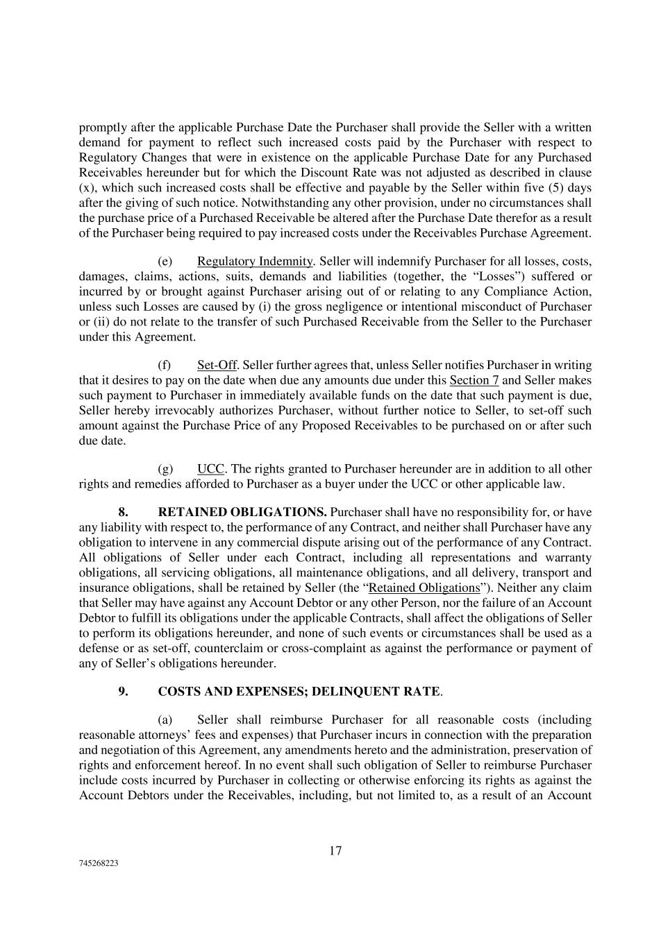 17 745268223 promptly after the applicable Purchase Date the Purchaser shall provide the Seller with a written demand for payment to reflect such increased costs paid by the Purchaser with respect to Regulatory Changes that were in existence on the applicable Purchase Date for any Purchased Receivables hereunder but for which the Discount Rate was not adjusted as described in clause (x), which such increased costs shall be effective and payable by the Seller within five (5) days after the giving of such notice. Notwithstanding any other provision, under no circumstances shall the purchase price of a Purchased Receivable be altered after the Purchase Date therefor as a result of the Purchaser being required to pay increased costs under the Receivables Purchase Agreement. (e) Regulatory Indemnity. Seller will indemnify Purchaser for all losses, costs, damages, claims, actions, suits, demands and liabilities (together, the “Losses”) suffered or incurred by or brought against Purchaser arising out of or relating to any Compliance Action, unless such Losses are caused by (i) the gross negligence or intentional misconduct of Purchaser or (ii) do not relate to the transfer of such Purchased Receivable from the Seller to the Purchaser under this Agreement. (f) Set-Off. Seller further agrees that, unless Seller notifies Purchaser in writing that it desires to pay on the date when due any amounts due under this Section 7 and Seller makes such payment to Purchaser in immediately available funds on the date that such payment is due, Seller hereby irrevocably authorizes Purchaser, without further notice to Seller, to set-off such amount against the Purchase Price of any Proposed Receivables to be purchased on or after such due date. (g) UCC. The rights granted to Purchaser hereunder are in addition to all other rights and remedies afforded to Purchaser as a buyer under the UCC or other applicable law. 8. RETAINED OBLIGATIONS. Purchaser shall have no responsibility for, or have any liability with respect to, the performance of any Contract, and neither shall Purchaser have any obligation to intervene in any commercial dispute arising out of the performance of any Contract. All obligations of Seller under each Contract, including all representations and warranty obligations, all servicing obligations, all maintenance obligations, and all delivery, transport and insurance obligations, shall be retained by Seller (the “Retained Obligations”). Neither any claim that Seller may have against any Account Debtor or any other Person, nor the failure of an Account Debtor to fulfill its obligations under the applicable Contracts, shall affect the obligations of Seller to perform its obligations hereunder, and none of such events or circumstances shall be used as a defense or as set-off, counterclaim or cross-complaint as against the performance or payment of any of Seller’s obligations hereunder. 9. COSTS AND EXPENSES; DELINQUENT RATE. (a) Seller shall reimburse Purchaser for all reasonable costs (including reasonable attorneys’ fees and expenses) that Purchaser incurs in connection with the preparation and negotiation of this Agreement, any amendments hereto and the administration, preservation of rights and enforcement hereof. In no event shall such obligation of Seller to reimburse Purchaser include costs incurred by Purchaser in collecting or otherwise enforcing its rights as against the Account Debtors under the Receivables, including, but not limited to, as a result of an Account
