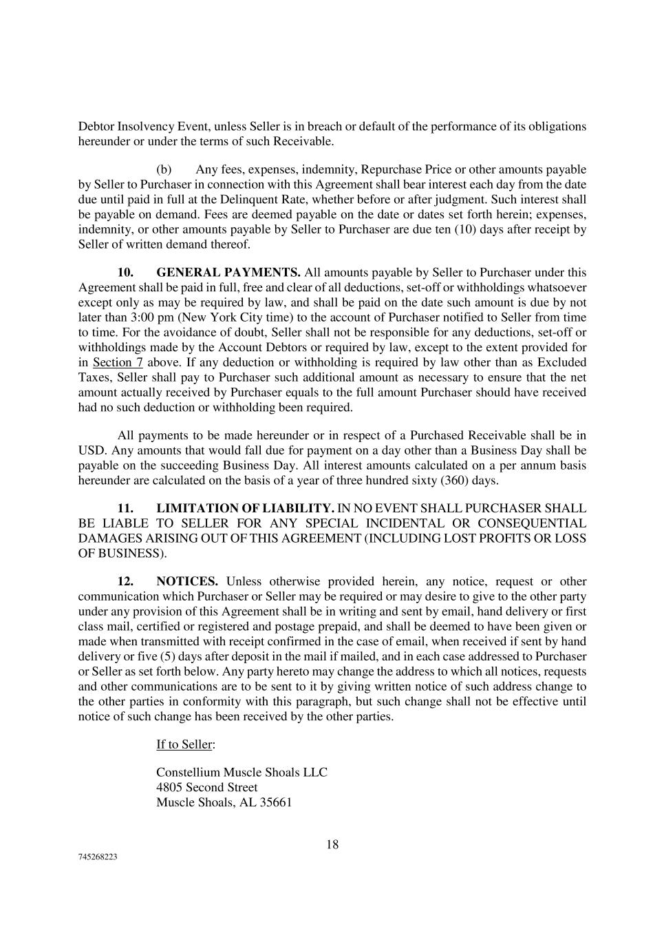 18 745268223 Debtor Insolvency Event, unless Seller is in breach or default of the performance of its obligations hereunder or under the terms of such Receivable. (b) Any fees, expenses, indemnity, Repurchase Price or other amounts payable by Seller to Purchaser in connection with this Agreement shall bear interest each day from the date due until paid in full at the Delinquent Rate, whether before or after judgment. Such interest shall be payable on demand. Fees are deemed payable on the date or dates set forth herein; expenses, indemnity, or other amounts payable by Seller to Purchaser are due ten (10) days after receipt by Seller of written demand thereof. 10. GENERAL PAYMENTS. All amounts payable by Seller to Purchaser under this Agreement shall be paid in full, free and clear of all deductions, set-off or withholdings whatsoever except only as may be required by law, and shall be paid on the date such amount is due by not later than 3:00 pm (New York City time) to the account of Purchaser notified to Seller from time to time. For the avoidance of doubt, Seller shall not be responsible for any deductions, set-off or withholdings made by the Account Debtors or required by law, except to the extent provided for in Section 7 above. If any deduction or withholding is required by law other than as Excluded Taxes, Seller shall pay to Purchaser such additional amount as necessary to ensure that the net amount actually received by Purchaser equals to the full amount Purchaser should have received had no such deduction or withholding been required. All payments to be made hereunder or in respect of a Purchased Receivable shall be in USD. Any amounts that would fall due for payment on a day other than a Business Day shall be payable on the succeeding Business Day. All interest amounts calculated on a per annum basis hereunder are calculated on the basis of a year of three hundred sixty (360) days. 11. LIMITATION OF LIABILITY. IN NO EVENT SHALL PURCHASER SHALL BE LIABLE TO SELLER FOR ANY SPECIAL INCIDENTAL OR CONSEQUENTIAL DAMAGES ARISING OUT OF THIS AGREEMENT (INCLUDING LOST PROFITS OR LOSS OF BUSINESS). 12. NOTICES. Unless otherwise provided herein, any notice, request or other communication which Purchaser or Seller may be required or may desire to give to the other party under any provision of this Agreement shall be in writing and sent by email, hand delivery or first class mail, certified or registered and postage prepaid, and shall be deemed to have been given or made when transmitted with receipt confirmed in the case of email, when received if sent by hand delivery or five (5) days after deposit in the mail if mailed, and in each case addressed to Purchaser or Seller as set forth below. Any party hereto may change the address to which all notices, requests and other communications are to be sent to it by giving written notice of such address change to the other parties in conformity with this paragraph, but such change shall not be effective until notice of such change has been received by the other parties. If to Seller: Constellium Muscle Shoals LLC 4805 Second Street Muscle Shoals, AL 35661