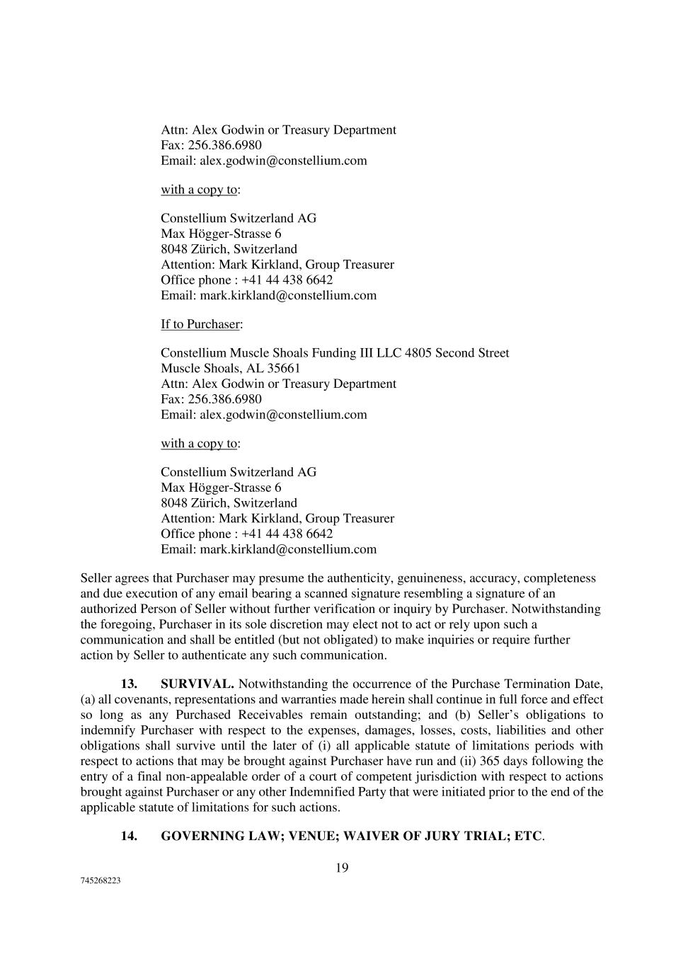 19 745268223 Attn: Alex Godwin or Treasury Department Fax: 256.386.6980 Email: alex.godwin@constellium.com with a copy to: Constellium Switzerland AG Max Högger-Strasse 6 8048 Zürich, Switzerland Attention: Mark Kirkland, Group Treasurer Office phone : +41 44 438 6642 Email: mark.kirkland@constellium.com If to Purchaser: Constellium Muscle Shoals Funding III LLC 4805 Second Street Muscle Shoals, AL 35661 Attn: Alex Godwin or Treasury Department Fax: 256.386.6980 Email: alex.godwin@constellium.com with a copy to: Constellium Switzerland AG Max Högger-Strasse 6 8048 Zürich, Switzerland Attention: Mark Kirkland, Group Treasurer Office phone : +41 44 438 6642 Email: mark.kirkland@constellium.com Seller agrees that Purchaser may presume the authenticity, genuineness, accuracy, completeness and due execution of any email bearing a scanned signature resembling a signature of an authorized Person of Seller without further verification or inquiry by Purchaser. Notwithstanding the foregoing, Purchaser in its sole discretion may elect not to act or rely upon such a communication and shall be entitled (but not obligated) to make inquiries or require further action by Seller to authenticate any such communication. 13. SURVIVAL. Notwithstanding the occurrence of the Purchase Termination Date, (a) all covenants, representations and warranties made herein shall continue in full force and effect so long as any Purchased Receivables remain outstanding; and (b) Seller’s obligations to indemnify Purchaser with respect to the expenses, damages, losses, costs, liabilities and other obligations shall survive until the later of (i) all applicable statute of limitations periods with respect to actions that may be brought against Purchaser have run and (ii) 365 days following the entry of a final non-appealable order of a court of competent jurisdiction with respect to actions brought against Purchaser or any other Indemnified Party that were initiated prior to the end of the applicable statute of limitations for such actions. 14. GOVERNING LAW; VENUE; WAIVER OF JURY TRIAL; ETC.