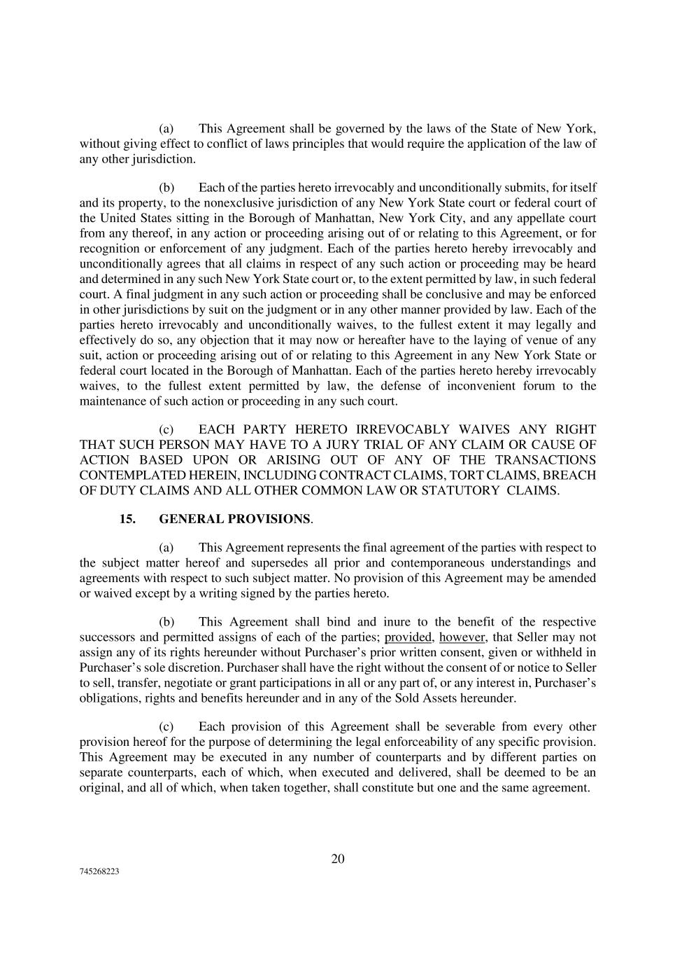 20 745268223 (a) This Agreement shall be governed by the laws of the State of New York, without giving effect to conflict of laws principles that would require the application of the law of any other jurisdiction. (b) Each of the parties hereto irrevocably and unconditionally submits, for itself and its property, to the nonexclusive jurisdiction of any New York State court or federal court of the United States sitting in the Borough of Manhattan, New York City, and any appellate court from any thereof, in any action or proceeding arising out of or relating to this Agreement, or for recognition or enforcement of any judgment. Each of the parties hereto hereby irrevocably and unconditionally agrees that all claims in respect of any such action or proceeding may be heard and determined in any such New York State court or, to the extent permitted by law, in such federal court. A final judgment in any such action or proceeding shall be conclusive and may be enforced in other jurisdictions by suit on the judgment or in any other manner provided by law. Each of the parties hereto irrevocably and unconditionally waives, to the fullest extent it may legally and effectively do so, any objection that it may now or hereafter have to the laying of venue of any suit, action or proceeding arising out of or relating to this Agreement in any New York State or federal court located in the Borough of Manhattan. Each of the parties hereto hereby irrevocably waives, to the fullest extent permitted by law, the defense of inconvenient forum to the maintenance of such action or proceeding in any such court. (c) EACH PARTY HERETO IRREVOCABLY WAIVES ANY RIGHT THAT SUCH PERSON MAY HAVE TO A JURY TRIAL OF ANY CLAIM OR CAUSE OF ACTION BASED UPON OR ARISING OUT OF ANY OF THE TRANSACTIONS CONTEMPLATED HEREIN, INCLUDING CONTRACT CLAIMS, TORT CLAIMS, BREACH OF DUTY CLAIMS AND ALL OTHER COMMON LAW OR STATUTORY CLAIMS. 15. GENERAL PROVISIONS. (a) This Agreement represents the final agreement of the parties with respect to the subject matter hereof and supersedes all prior and contemporaneous understandings and agreements with respect to such subject matter. No provision of this Agreement may be amended or waived except by a writing signed by the parties hereto. (b) This Agreement shall bind and inure to the benefit of the respective successors and permitted assigns of each of the parties; provided, however, that Seller may not assign any of its rights hereunder without Purchaser’s prior written consent, given or withheld in Purchaser’s sole discretion. Purchaser shall have the right without the consent of or notice to Seller to sell, transfer, negotiate or grant participations in all or any part of, or any interest in, Purchaser’s obligations, rights and benefits hereunder and in any of the Sold Assets hereunder. (c) Each provision of this Agreement shall be severable from every other provision hereof for the purpose of determining the legal enforceability of any specific provision. This Agreement may be executed in any number of counterparts and by different parties on separate counterparts, each of which, when executed and delivered, shall be deemed to be an original, and all of which, when taken together, shall constitute but one and the same agreement.