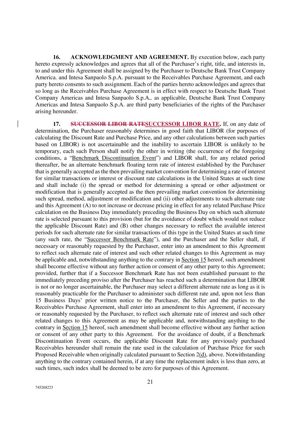 21 745268223 16. ACKNOWLEDGMENT AND AGREEMENT. By execution below, each party hereto expressly acknowledges and agrees that all of the Purchaser’s right, title, and interests in, to and under this Agreement shall be assigned by the Purchaser to Deutsche Bank Trust Company America. and Intesa Sanpaolo S.p.A. pursuant to the Receivables Purchase Agreement, and each party hereto consents to such assignment. Each of the parties hereto acknowledges and agrees that so long as the Receivables Purchase Agreement is in effect with respect to Deutsche Bank Trust Company Americas and Intesa Sanpaolo S.p.A,. as applicable, Deutsche Bank Trust Company Americas and Intesa Sanpaolo S.p.A. are third party beneficiaries of the rights of the Purchaser arising hereunder. 17. SUCCESSOR LIBOR RATESUCCESSOR LIBOR RATE. If, on any date of determination, the Purchaser reasonably determines in good faith that LIBOR (for purposes of calculating the Discount Rate and Purchase Price, and any other calculations between such parties based on LIBOR) is not ascertainable and the inability to ascertain LIBOR is unlikely to be temporary, each such Person shall notify the other in writing (the occurrence of the foregoing conditions, a “Benchmark Discontinuation Event”) and LIBOR shall, for any related period thereafter, be an alternate benchmark floating term rate of interest established by the Purchaser that is generally accepted as the then prevailing market convention for determining a rate of interest for similar transactions or interest or discount rate calculations in the United States at such time and shall include (i) the spread or method for determining a spread or other adjustment or modification that is generally accepted as the then prevailing market convention for determining such spread, method, adjustment or modification and (ii) other adjustments to such alternate rate and this Agreement (A) to not increase or decrease pricing in effect for any related Purchase Price calculation on the Business Day immediately preceding the Business Day on which such alternate rate is selected pursuant to this provision (but for the avoidance of doubt which would not reduce the applicable Discount Rate) and (B) other changes necessary to reflect the available interest periods for such alternate rate for similar transactions of this type in the United States at such time (any such rate, the “Successor Benchmark Rate”), and the Purchaser and the Seller shall, if necessary or reasonably requested by the Purchaser, enter into an amendment to this Agreement to reflect such alternate rate of interest and such other related changes to this Agreement as may be applicable and, notwithstanding anything to the contrary in Section 15 hereof, such amendment shall become effective without any further action or consent of any other party to this Agreement; provided, further that if a Successor Benchmark Rate has not been established pursuant to the immediately preceding proviso after the Purchaser has reached such a determination that LIBOR is not or no longer ascertainable, the Purchaser may select a different alternate rate as long as it is reasonably practicable for the Purchaser to administer such different rate and, upon not less than 15 Business Days’ prior written notice to the Purchaser, the Seller and the parties to the Receivables Purchase Agreement, shall enter into an amendment to this Agreement, if necessary or reasonably requested by the Purchaser, to reflect such alternate rate of interest and such other related changes to this Agreement as may be applicable and, notwithstanding anything to the contrary in Section 15 hereof, such amendment shall become effective without any further action or consent of any other party to this Agreement. For the avoidance of doubt, if a Benchmark Discontinuation Event occurs, the applicable Discount Rate for any previously purchased Receivables hereunder shall remain the rate used in the calculation of Purchase Price for such Proposed Receivable when originally calculated pursuant to Section 2(d), above. Notwithstanding anything to the contrary contained herein, if at any time the replacement index is less than zero, at such times, such index shall be deemed to be zero for purposes of this Agreement.