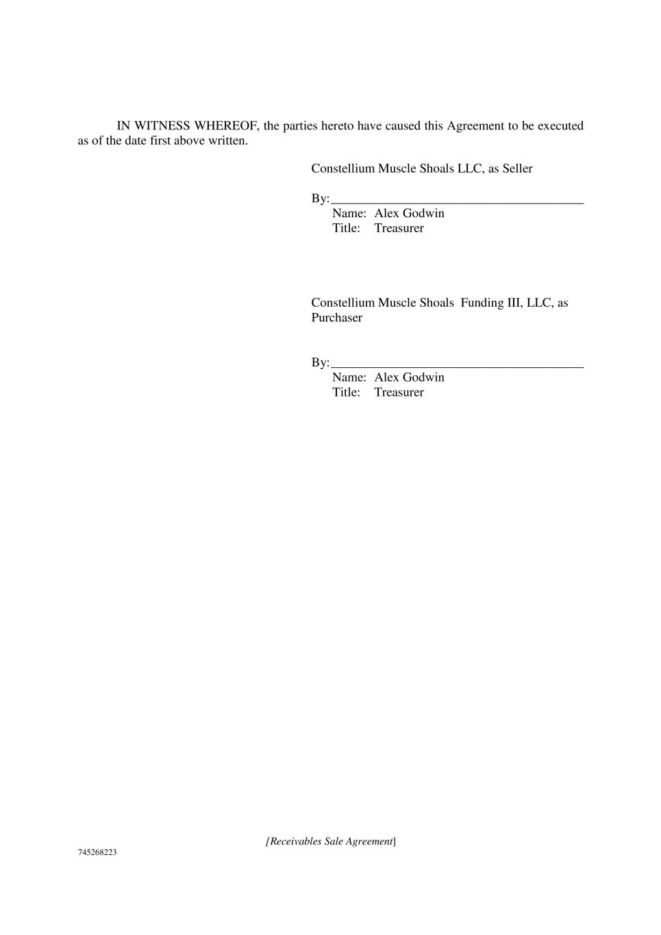 [Receivables Sale Agreement] 745268223 IN WITNESS WHEREOF, the parties hereto have caused this Agreement to be executed as of the date first above written. Constellium Muscle Shoals LLC, as Seller By: _______________________________________ Name: Alex Godwin Title: Treasurer Constellium Muscle Shoals Funding III, LLC, as Purchaser By: _______________________________________ Name: Alex Godwin Title: Treasurer