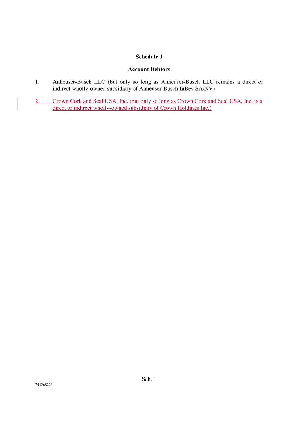 Sch. 1 745268223 Schedule 1 Account Debtors 1. Anheuser-Busch LLC (but only so long as Anheuser-Busch LLC remains a direct or indirect wholly-owned subsidiary of Anheuser-Busch InBev SA/NV) 2. Crown Cork and Seal USA, Inc. (but only so long as Crown Cork and Seal USA, Inc. is a direct or indirect wholly-owned subsidiary of Crown Holdings Inc.)