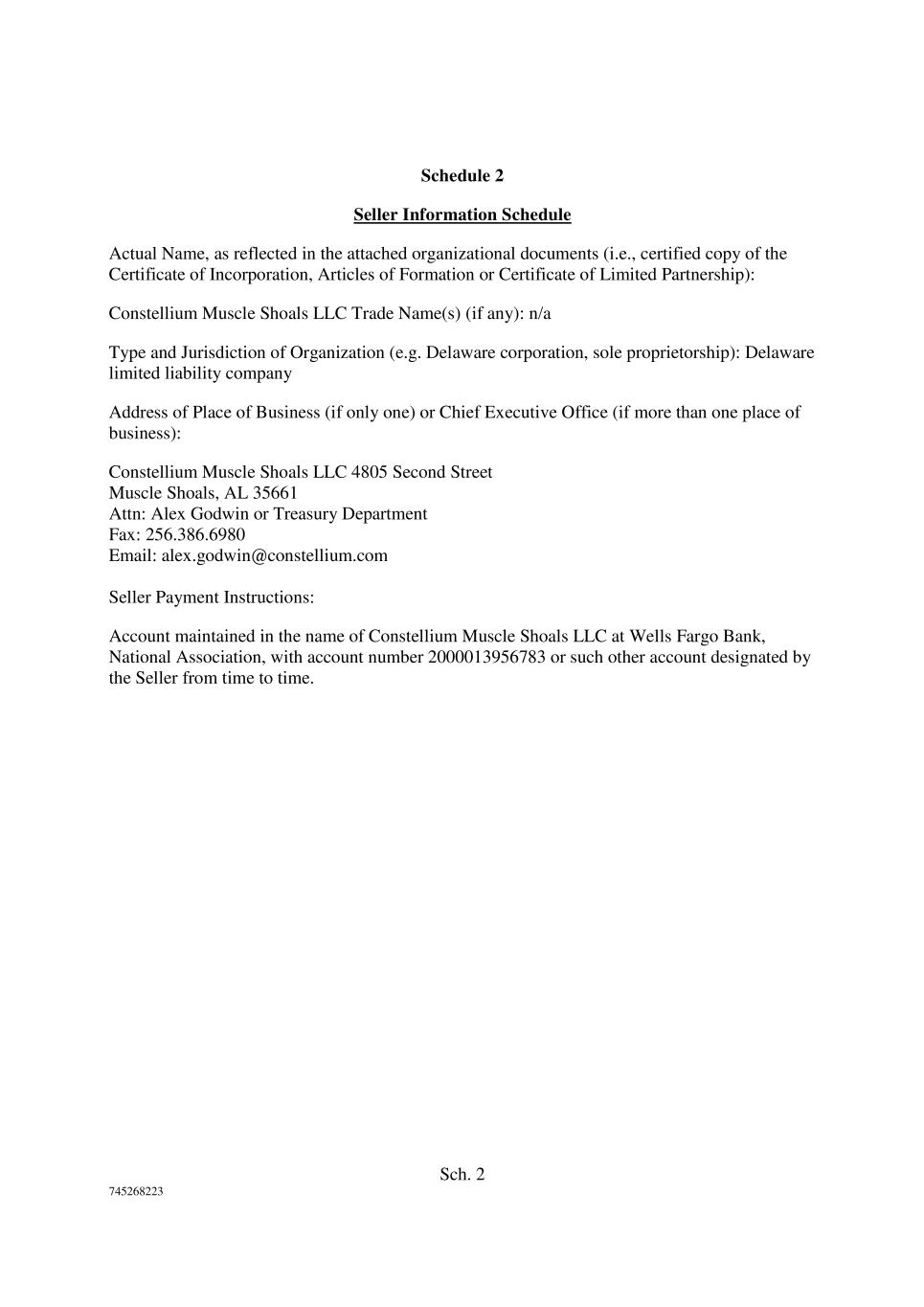 Sch. 2 745268223 Schedule 2 Seller Information Schedule Actual Name, as reflected in the attached organizational documents (i.e., certified copy of the Certificate of Incorporation, Articles of Formation or Certificate of Limited Partnership): Constellium Muscle Shoals LLC Trade Name(s) (if any): n/a Type and Jurisdiction of Organization (e.g. Delaware corporation, sole proprietorship): Delaware limited liability company Address of Place of Business (if only one) or Chief Executive Office (if more than one place of business): Constellium Muscle Shoals LLC 4805 Second Street Muscle Shoals, AL 35661 Attn: Alex Godwin or Treasury Department Fax: 256.386.6980 Email: alex.godwin@constellium.com Seller Payment Instructions: Account maintained in the name of Constellium Muscle Shoals LLC at Wells Fargo Bank, National Association, with account number 2000013956783 or such other account designated by the Seller from time to time.