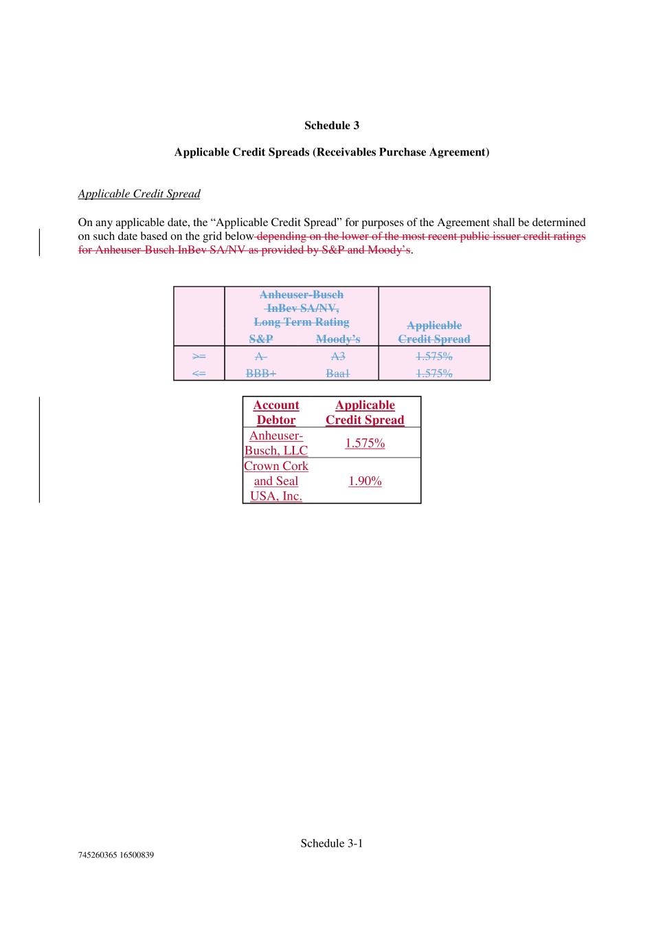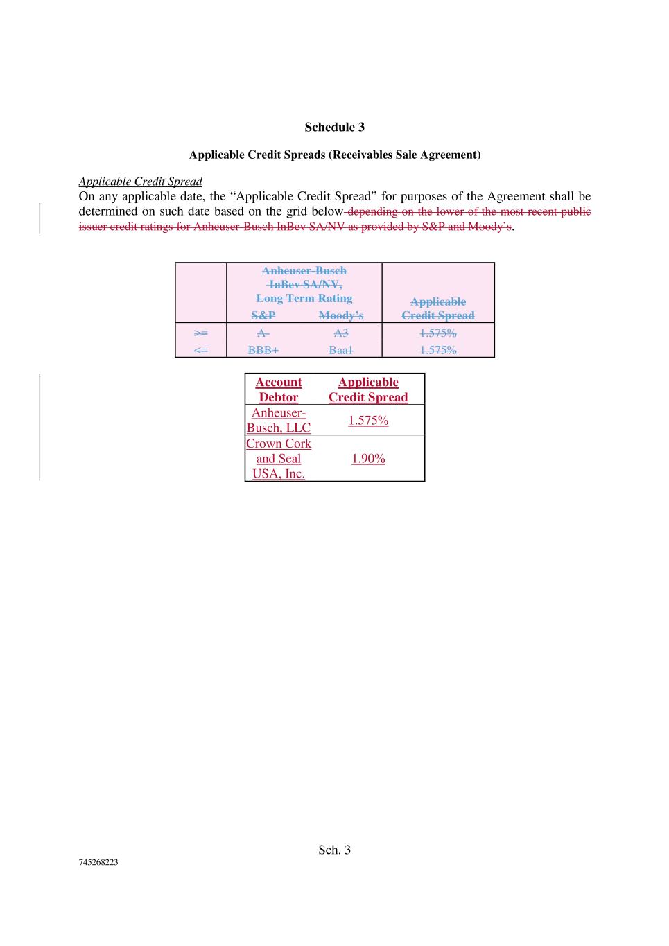 Sch. 3 745268223 Schedule 3 Applicable Credit Spreads (Receivables Sale Agreement) Applicable Credit Spread On any applicable date, the “Applicable Credit Spread” for purposes of the Agreement shall be determined on such date based on the grid below depending on the lower of the most recent public issuer credit ratings for Anheuser-Busch InBev SA/NV as provided by S&P and Moody’s. Anheuser-Busch InBev SA/NV, Long Term Rating Applicable Credit Spread S&P Moody’s >= A- A3 1.575% <= BBB+ Baa1 1.575% Account Debtor Applicable Credit Spread Anheuser- Busch, LLC 1.575% Crown Cork and Seal USA, Inc. 1.90%