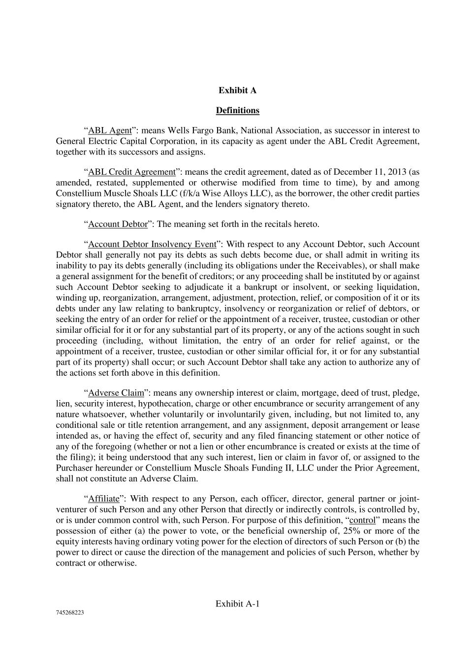 Exhibit A-1 745268223 Exhibit A Definitions “ABL Agent”: means Wells Fargo Bank, National Association, as successor in interest to General Electric Capital Corporation, in its capacity as agent under the ABL Credit Agreement, together with its successors and assigns. “ABL Credit Agreement”: means the credit agreement, dated as of December 11, 2013 (as amended, restated, supplemented or otherwise modified from time to time), by and among Constellium Muscle Shoals LLC (f/k/a Wise Alloys LLC), as the borrower, the other credit parties signatory thereto, the ABL Agent, and the lenders signatory thereto. “Account Debtor”: The meaning set forth in the recitals hereto. “Account Debtor Insolvency Event”: With respect to any Account Debtor, such Account Debtor shall generally not pay its debts as such debts become due, or shall admit in writing its inability to pay its debts generally (including its obligations under the Receivables), or shall make a general assignment for the benefit of creditors; or any proceeding shall be instituted by or against such Account Debtor seeking to adjudicate it a bankrupt or insolvent, or seeking liquidation, winding up, reorganization, arrangement, adjustment, protection, relief, or composition of it or its debts under any law relating to bankruptcy, insolvency or reorganization or relief of debtors, or seeking the entry of an order for relief or the appointment of a receiver, trustee, custodian or other similar official for it or for any substantial part of its property, or any of the actions sought in such proceeding (including, without limitation, the entry of an order for relief against, or the appointment of a receiver, trustee, custodian or other similar official for, it or for any substantial part of its property) shall occur; or such Account Debtor shall take any action to authorize any of the actions set forth above in this definition. “Adverse Claim”: means any ownership interest or claim, mortgage, deed of trust, pledge, lien, security interest, hypothecation, charge or other encumbrance or security arrangement of any nature whatsoever, whether voluntarily or involuntarily given, including, but not limited to, any conditional sale or title retention arrangement, and any assignment, deposit arrangement or lease intended as, or having the effect of, security and any filed financing statement or other notice of any of the foregoing (whether or not a lien or other encumbrance is created or exists at the time of the filing); it being understood that any such interest, lien or claim in favor of, or assigned to the Purchaser hereunder or Constellium Muscle Shoals Funding II, LLC under the Prior Agreement, shall not constitute an Adverse Claim. “Affiliate”: With respect to any Person, each officer, director, general partner or joint- venturer of such Person and any other Person that directly or indirectly controls, is controlled by, or is under common control with, such Person. For purpose of this definition, “control” means the possession of either (a) the power to vote, or the beneficial ownership of, 25% or more of the equity interests having ordinary voting power for the election of directors of such Person or (b) the power to direct or cause the direction of the management and policies of such Person, whether by contract or otherwise.