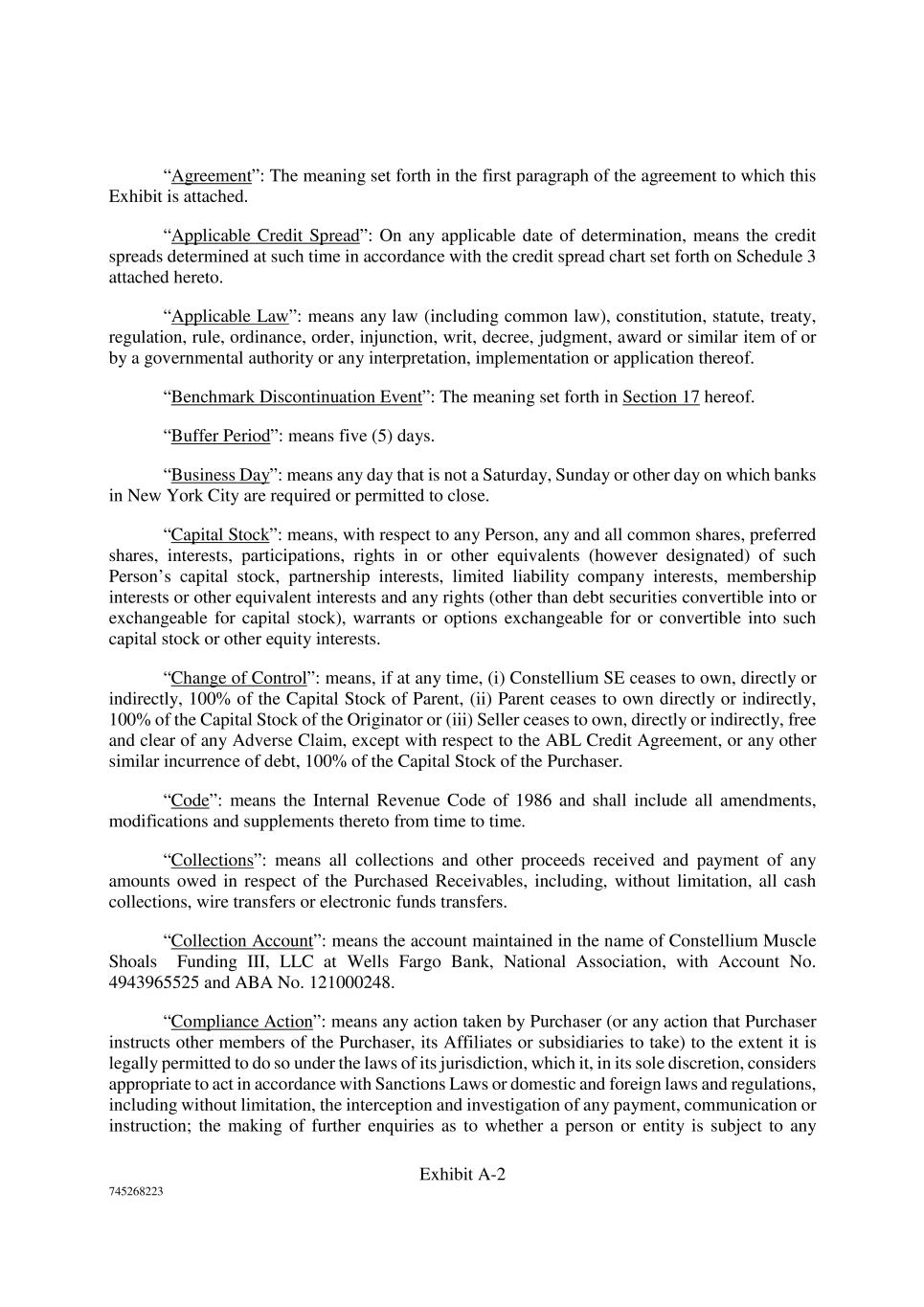 Exhibit A-2 745268223 “Agreement”: The meaning set forth in the first paragraph of the agreement to which this Exhibit is attached. “Applicable Credit Spread”: On any applicable date of determination, means the credit spreads determined at such time in accordance with the credit spread chart set forth on Schedule 3 attached hereto. “Applicable Law”: means any law (including common law), constitution, statute, treaty, regulation, rule, ordinance, order, injunction, writ, decree, judgment, award or similar item of or by a governmental authority or any interpretation, implementation or application thereof. “Benchmark Discontinuation Event”: The meaning set forth in Section 17 hereof. “Buffer Period”: means five (5) days. “Business Day”: means any day that is not a Saturday, Sunday or other day on which banks in New York City are required or permitted to close. “Capital Stock”: means, with respect to any Person, any and all common shares, preferred shares, interests, participations, rights in or other equivalents (however designated) of such Person’s capital stock, partnership interests, limited liability company interests, membership interests or other equivalent interests and any rights (other than debt securities convertible into or exchangeable for capital stock), warrants or options exchangeable for or convertible into such capital stock or other equity interests. “Change of Control”: means, if at any time, (i) Constellium SE ceases to own, directly or indirectly, 100% of the Capital Stock of Parent, (ii) Parent ceases to own directly or indirectly, 100% of the Capital Stock of the Originator or (iii) Seller ceases to own, directly or indirectly, free and clear of any Adverse Claim, except with respect to the ABL Credit Agreement, or any other similar incurrence of debt, 100% of the Capital Stock of the Purchaser. “Code”: means the Internal Revenue Code of 1986 and shall include all amendments, modifications and supplements thereto from time to time. “Collections”: means all collections and other proceeds received and payment of any amounts owed in respect of the Purchased Receivables, including, without limitation, all cash collections, wire transfers or electronic funds transfers. “Collection Account”: means the account maintained in the name of Constellium Muscle Shoals Funding III, LLC at Wells Fargo Bank, National Association, with Account No. 4943965525 and ABA No. 121000248. “Compliance Action”: means any action taken by Purchaser (or any action that Purchaser instructs other members of the Purchaser, its Affiliates or subsidiaries to take) to the extent it is legally permitted to do so under the laws of its jurisdiction, which it, in its sole discretion, considers appropriate to act in accordance with Sanctions Laws or domestic and foreign laws and regulations, including without limitation, the interception and investigation of any payment, communication or instruction; the making of further enquiries as to whether a person or entity is subject to any