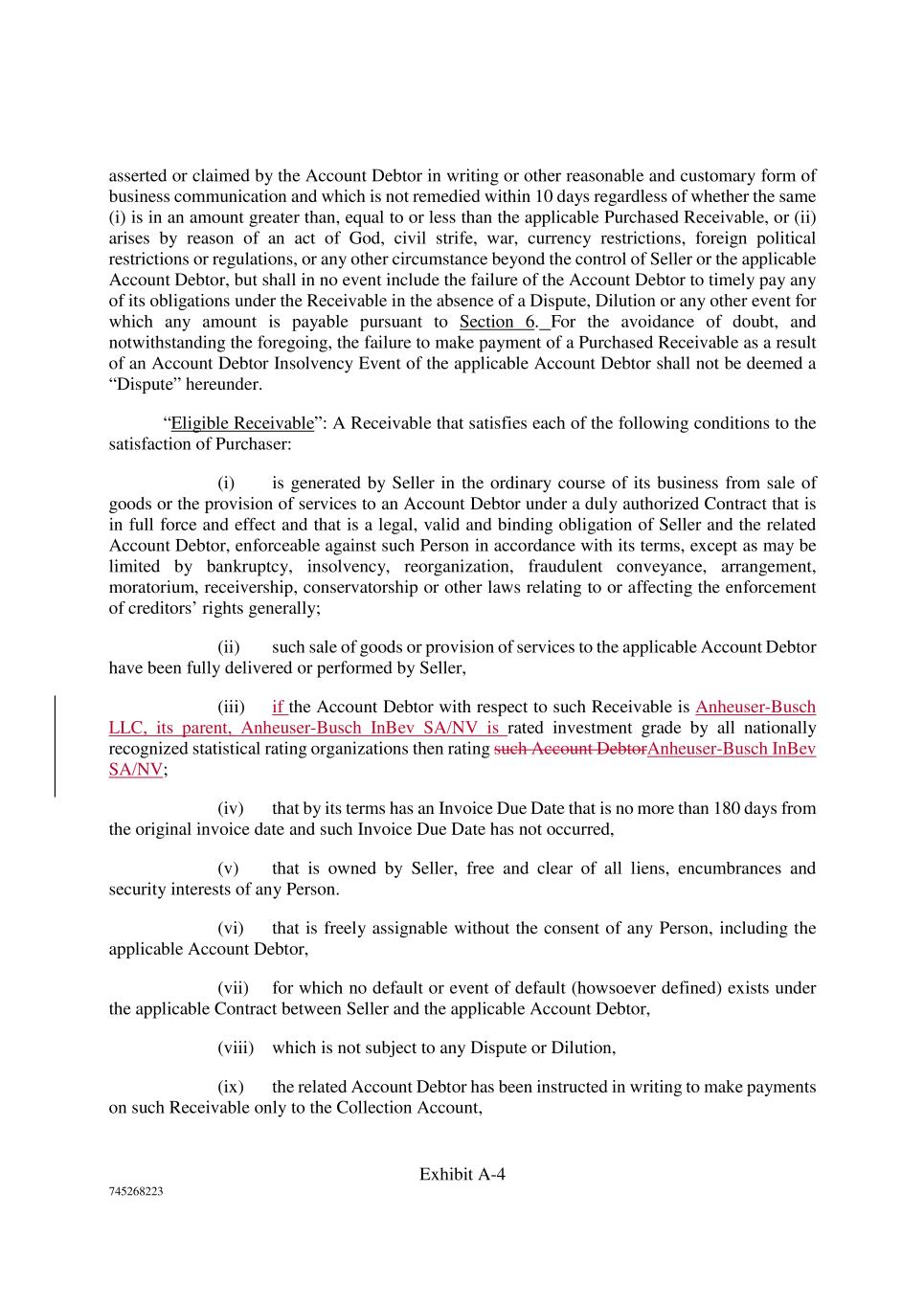 Exhibit A-4 745268223 asserted or claimed by the Account Debtor in writing or other reasonable and customary form of business communication and which is not remedied within 10 days regardless of whether the same (i) is in an amount greater than, equal to or less than the applicable Purchased Receivable, or (ii) arises by reason of an act of God, civil strife, war, currency restrictions, foreign political restrictions or regulations, or any other circumstance beyond the control of Seller or the applicable Account Debtor, but shall in no event include the failure of the Account Debtor to timely pay any of its obligations under the Receivable in the absence of a Dispute, Dilution or any other event for which any amount is payable pursuant to Section 6. For the avoidance of doubt, and notwithstanding the foregoing, the failure to make payment of a Purchased Receivable as a result of an Account Debtor Insolvency Event of the applicable Account Debtor shall not be deemed a “Dispute” hereunder. “Eligible Receivable”: A Receivable that satisfies each of the following conditions to the satisfaction of Purchaser: (i) is generated by Seller in the ordinary course of its business from sale of goods or the provision of services to an Account Debtor under a duly authorized Contract that is in full force and effect and that is a legal, valid and binding obligation of Seller and the related Account Debtor, enforceable against such Person in accordance with its terms, except as may be limited by bankruptcy, insolvency, reorganization, fraudulent conveyance, arrangement, moratorium, receivership, conservatorship or other laws relating to or affecting the enforcement of creditors’ rights generally; (ii) such sale of goods or provision of services to the applicable Account Debtor have been fully delivered or performed by Seller, (iii) if the Account Debtor with respect to such Receivable is Anheuser-Busch LLC, its parent, Anheuser-Busch InBev SA/NV is rated investment grade by all nationally recognized statistical rating organizations then rating such Account DebtorAnheuser-Busch InBev SA/NV; (iv) that by its terms has an Invoice Due Date that is no more than 180 days from the original invoice date and such Invoice Due Date has not occurred, (v) that is owned by Seller, free and clear of all liens, encumbrances and security interests of any Person. (vi) that is freely assignable without the consent of any Person, including the applicable Account Debtor, (vii) for which no default or event of default (howsoever defined) exists under the applicable Contract between Seller and the applicable Account Debtor, (viii) which is not subject to any Dispute or Dilution, (ix) the related Account Debtor has been instructed in writing to make payments on such Receivable only to the Collection Account,