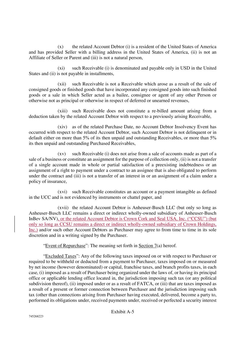 Exhibit A-5 745268223 (x) the related Account Debtor (i) is a resident of the United States of America and has provided Seller with a billing address in the United States of America, (ii) is not an Affiliate of Seller or Parent and (iii) is not a natural person, (xi) such Receivable (i) is denominated and payable only in USD in the United States and (ii) is not payable in installments, (xii) such Receivable is not a Receivable which arose as a result of the sale of consigned goods or finished goods that have incorporated any consigned goods into such finished goods or a sale in which Seller acted as a bailee, consignee or agent of any other Person or otherwise not as principal or otherwise in respect of deferred or unearned revenues, (xiii) such Receivable does not constitute a re-billed amount arising from a deduction taken by the related Account Debtor with respect to a previously arising Receivable, (xiv) as of the related Purchase Date, no Account Debtor Insolvency Event has occurred with respect to the related Account Debtor, such Account Debtor is not delinquent or in default either on more than 5% of its then unpaid and outstanding Receivables, or more than 5% its then unpaid and outstanding Purchased Receivables, (xv) such Receivable (i) does not arise from a sale of accounts made as part of a sale of a business or constitute an assignment for the purpose of collection only, (ii) is not a transfer of a single account made in whole or partial satisfaction of a preexisting indebtedness or an assignment of a right to payment under a contract to an assignee that is also obligated to perform under the contract and (iii) is not a transfer of an interest in or an assignment of a claim under a policy of insurance, (xvi) such Receivable constitutes an account or a payment intangible as defined in the UCC and is not evidenced by instruments or chattel paper, and (xvii) the related Account Debtor is Anheuser-Busch LLC (but only so long as Anheuser-Busch LLC remains a direct or indirect wholly-owned subsidiary of Anheuser-Busch InBev SA/NV), or the related Account Debtor is Crown Cork and Seal USA, Inc. (“CCSU”) (but only so long as CCSU remains a direct or indirect wholly-owned subsidiary of Crown Holdings, Inc.) and/or such other Account Debtors as Purchaser may agree to from time to time in its sole discretion and in a writing signed by the Purchaser. “Event of Repurchase”: The meaning set forth in Section 7(a) hereof. “Excluded Taxes”: Any of the following taxes imposed on or with respect to Purchaser or required to be withheld or deducted from a payment to Purchaser, taxes imposed on or measured by net income (however denominated) or capital, franchise taxes, and branch profits taxes, in each case, (i) imposed as a result of Purchaser being organized under the laws of, or having its principal office or applicable lending office located in, the jurisdiction imposing such tax (or any political subdivision thereof), (ii) imposed under or as a result of FATCA, or (iii) that are taxes imposed as a result of a present or former connection between Purchaser and the jurisdiction imposing such tax (other than connections arising from Purchaser having executed, delivered, become a party to, performed its obligations under, received payments under, received or perfected a security interest