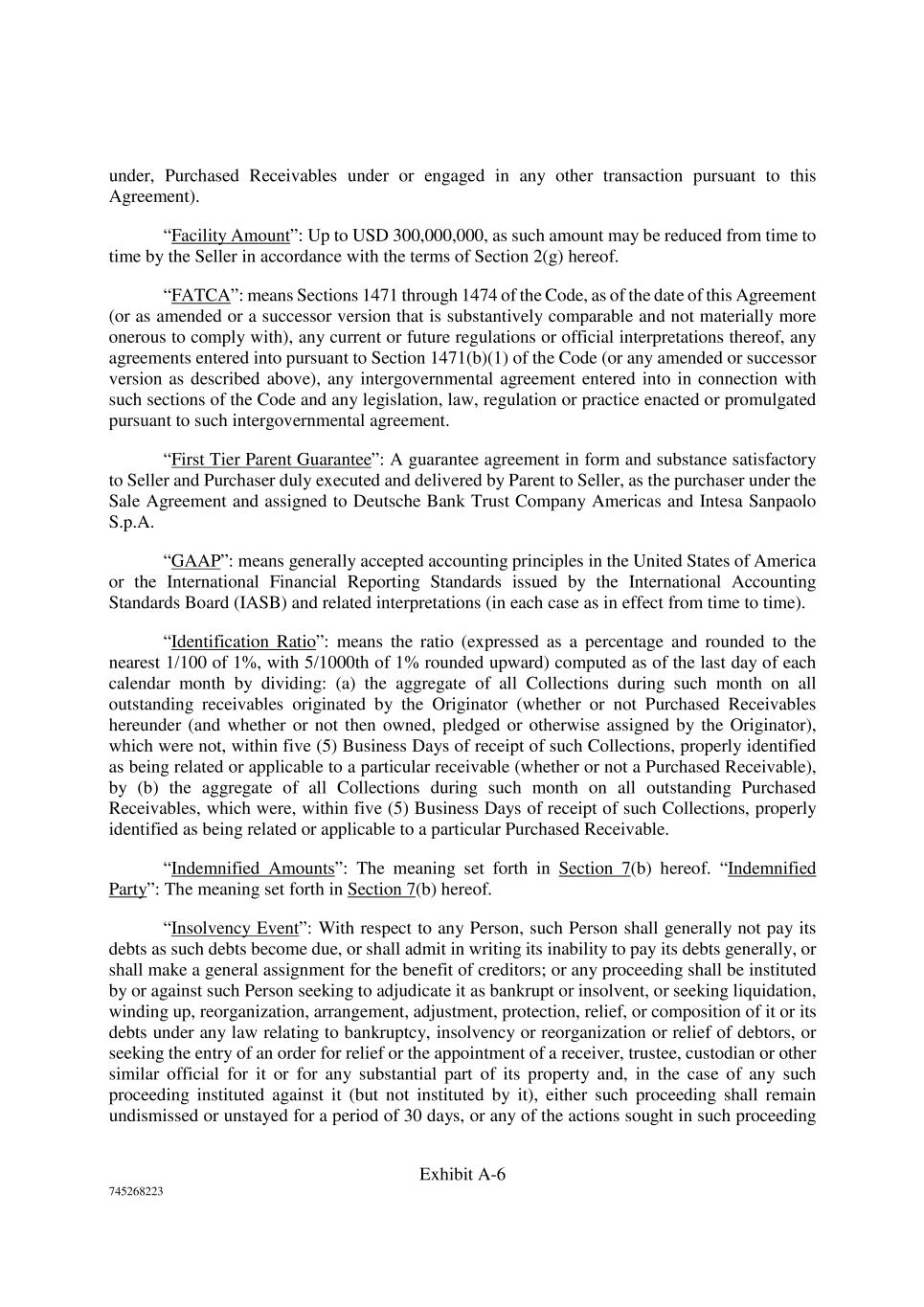 Exhibit A-6 745268223 under, Purchased Receivables under or engaged in any other transaction pursuant to this Agreement). “Facility Amount”: Up to USD 300,000,000, as such amount may be reduced from time to time by the Seller in accordance with the terms of Section 2(g) hereof. “FATCA”: means Sections 1471 through 1474 of the Code, as of the date of this Agreement (or as amended or a successor version that is substantively comparable and not materially more onerous to comply with), any current or future regulations or official interpretations thereof, any agreements entered into pursuant to Section 1471(b)(1) of the Code (or any amended or successor version as described above), any intergovernmental agreement entered into in connection with such sections of the Code and any legislation, law, regulation or practice enacted or promulgated pursuant to such intergovernmental agreement. “First Tier Parent Guarantee”: A guarantee agreement in form and substance satisfactory to Seller and Purchaser duly executed and delivered by Parent to Seller, as the purchaser under the Sale Agreement and assigned to Deutsche Bank Trust Company Americas and Intesa Sanpaolo S.p.A. “GAAP”: means generally accepted accounting principles in the United States of America or the International Financial Reporting Standards issued by the International Accounting Standards Board (IASB) and related interpretations (in each case as in effect from time to time). “Identification Ratio”: means the ratio (expressed as a percentage and rounded to the nearest 1/100 of 1%, with 5/1000th of 1% rounded upward) computed as of the last day of each calendar month by dividing: (a) the aggregate of all Collections during such month on all outstanding receivables originated by the Originator (whether or not Purchased Receivables hereunder (and whether or not then owned, pledged or otherwise assigned by the Originator), which were not, within five (5) Business Days of receipt of such Collections, properly identified as being related or applicable to a particular receivable (whether or not a Purchased Receivable), by (b) the aggregate of all Collections during such month on all outstanding Purchased Receivables, which were, within five (5) Business Days of receipt of such Collections, properly identified as being related or applicable to a particular Purchased Receivable. “Indemnified Amounts”: The meaning set forth in Section 7(b) hereof. “Indemnified Party”: The meaning set forth in Section 7(b) hereof. “Insolvency Event”: With respect to any Person, such Person shall generally not pay its debts as such debts become due, or shall admit in writing its inability to pay its debts generally, or shall make a general assignment for the benefit of creditors; or any proceeding shall be instituted by or against such Person seeking to adjudicate it as bankrupt or insolvent, or seeking liquidation, winding up, reorganization, arrangement, adjustment, protection, relief, or composition of it or its debts under any law relating to bankruptcy, insolvency or reorganization or relief of debtors, or seeking the entry of an order for relief or the appointment of a receiver, trustee, custodian or other similar official for it or for any substantial part of its property and, in the case of any such proceeding instituted against it (but not instituted by it), either such proceeding shall remain undismissed or unstayed for a period of 30 days, or any of the actions sought in such proceeding