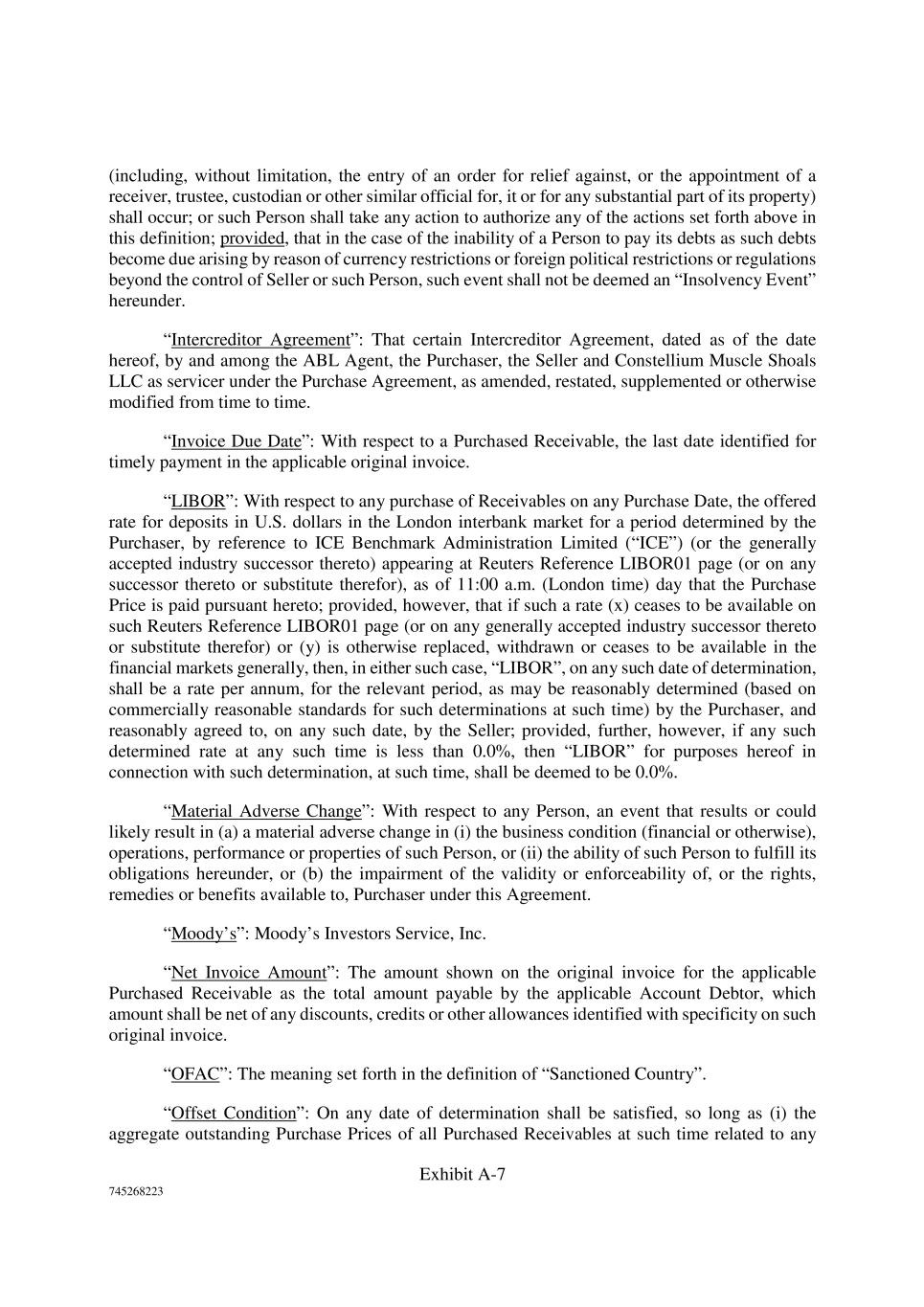 Exhibit A-7 745268223 (including, without limitation, the entry of an order for relief against, or the appointment of a receiver, trustee, custodian or other similar official for, it or for any substantial part of its property) shall occur; or such Person shall take any action to authorize any of the actions set forth above in this definition; provided, that in the case of the inability of a Person to pay its debts as such debts become due arising by reason of currency restrictions or foreign political restrictions or regulations beyond the control of Seller or such Person, such event shall not be deemed an “Insolvency Event” hereunder. “Intercreditor Agreement”: That certain Intercreditor Agreement, dated as of the date hereof, by and among the ABL Agent, the Purchaser, the Seller and Constellium Muscle Shoals LLC as servicer under the Purchase Agreement, as amended, restated, supplemented or otherwise modified from time to time. “Invoice Due Date”: With respect to a Purchased Receivable, the last date identified for timely payment in the applicable original invoice. “LIBOR”: With respect to any purchase of Receivables on any Purchase Date, the offered rate for deposits in U.S. dollars in the London interbank market for a period determined by the Purchaser, by reference to ICE Benchmark Administration Limited (“ICE”) (or the generally accepted industry successor thereto) appearing at Reuters Reference LIBOR01 page (or on any successor thereto or substitute therefor), as of 11:00 a.m. (London time) day that the Purchase Price is paid pursuant hereto; provided, however, that if such a rate (x) ceases to be available on such Reuters Reference LIBOR01 page (or on any generally accepted industry successor thereto or substitute therefor) or (y) is otherwise replaced, withdrawn or ceases to be available in the financial markets generally, then, in either such case, “LIBOR”, on any such date of determination, shall be a rate per annum, for the relevant period, as may be reasonably determined (based on commercially reasonable standards for such determinations at such time) by the Purchaser, and reasonably agreed to, on any such date, by the Seller; provided, further, however, if any such determined rate at any such time is less than 0.0%, then “LIBOR” for purposes hereof in connection with such determination, at such time, shall be deemed to be 0.0%. “Material Adverse Change”: With respect to any Person, an event that results or could likely result in (a) a material adverse change in (i) the business condition (financial or otherwise), operations, performance or properties of such Person, or (ii) the ability of such Person to fulfill its obligations hereunder, or (b) the impairment of the validity or enforceability of, or the rights, remedies or benefits available to, Purchaser under this Agreement. “Moody’s”: Moody’s Investors Service, Inc. “Net Invoice Amount”: The amount shown on the original invoice for the applicable Purchased Receivable as the total amount payable by the applicable Account Debtor, which amount shall be net of any discounts, credits or other allowances identified with specificity on such original invoice. “OFAC”: The meaning set forth in the definition of “Sanctioned Country”. “Offset Condition”: On any date of determination shall be satisfied, so long as (i) the aggregate outstanding Purchase Prices of all Purchased Receivables at such time related to any