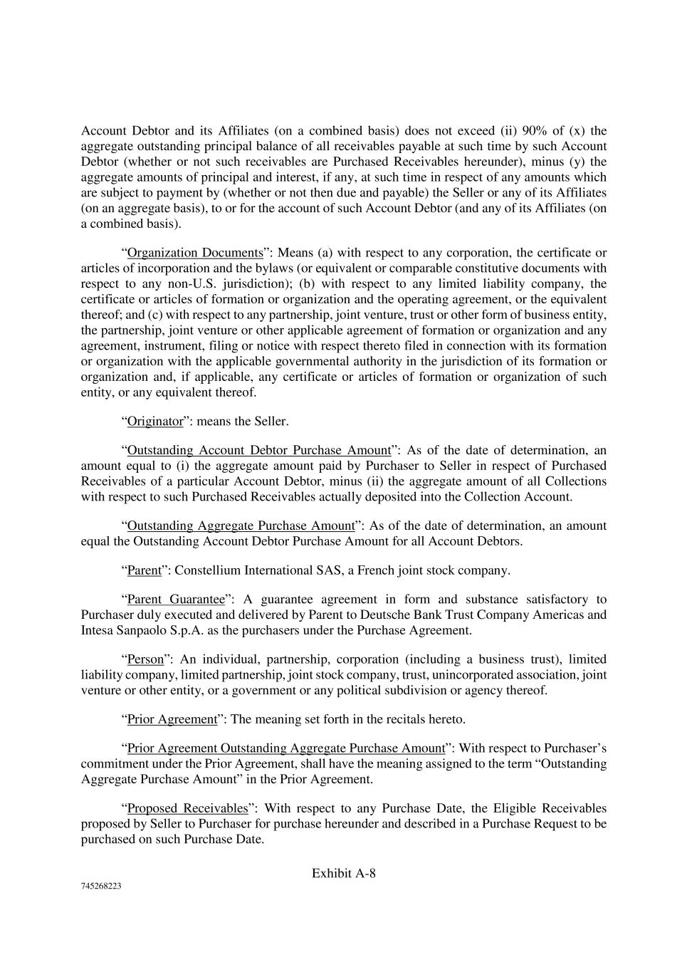 Exhibit A-8 745268223 Account Debtor and its Affiliates (on a combined basis) does not exceed (ii) 90% of (x) the aggregate outstanding principal balance of all receivables payable at such time by such Account Debtor (whether or not such receivables are Purchased Receivables hereunder), minus (y) the aggregate amounts of principal and interest, if any, at such time in respect of any amounts which are subject to payment by (whether or not then due and payable) the Seller or any of its Affiliates (on an aggregate basis), to or for the account of such Account Debtor (and any of its Affiliates (on a combined basis). “Organization Documents”: Means (a) with respect to any corporation, the certificate or articles of incorporation and the bylaws (or equivalent or comparable constitutive documents with respect to any non-U.S. jurisdiction); (b) with respect to any limited liability company, the certificate or articles of formation or organization and the operating agreement, or the equivalent thereof; and (c) with respect to any partnership, joint venture, trust or other form of business entity, the partnership, joint venture or other applicable agreement of formation or organization and any agreement, instrument, filing or notice with respect thereto filed in connection with its formation or organization with the applicable governmental authority in the jurisdiction of its formation or organization and, if applicable, any certificate or articles of formation or organization of such entity, or any equivalent thereof. “Originator”: means the Seller. “Outstanding Account Debtor Purchase Amount”: As of the date of determination, an amount equal to (i) the aggregate amount paid by Purchaser to Seller in respect of Purchased Receivables of a particular Account Debtor, minus (ii) the aggregate amount of all Collections with respect to such Purchased Receivables actually deposited into the Collection Account. “Outstanding Aggregate Purchase Amount”: As of the date of determination, an amount equal the Outstanding Account Debtor Purchase Amount for all Account Debtors. “Parent”: Constellium International SAS, a French joint stock company. “Parent Guarantee”: A guarantee agreement in form and substance satisfactory to Purchaser duly executed and delivered by Parent to Deutsche Bank Trust Company Americas and Intesa Sanpaolo S.p.A. as the purchasers under the Purchase Agreement. “Person”: An individual, partnership, corporation (including a business trust), limited liability company, limited partnership, joint stock company, trust, unincorporated association, joint venture or other entity, or a government or any political subdivision or agency thereof. “Prior Agreement”: The meaning set forth in the recitals hereto. “Prior Agreement Outstanding Aggregate Purchase Amount”: With respect to Purchaser’s commitment under the Prior Agreement, shall have the meaning assigned to the term “Outstanding Aggregate Purchase Amount” in the Prior Agreement. “Proposed Receivables”: With respect to any Purchase Date, the Eligible Receivables proposed by Seller to Purchaser for purchase hereunder and described in a Purchase Request to be purchased on such Purchase Date.